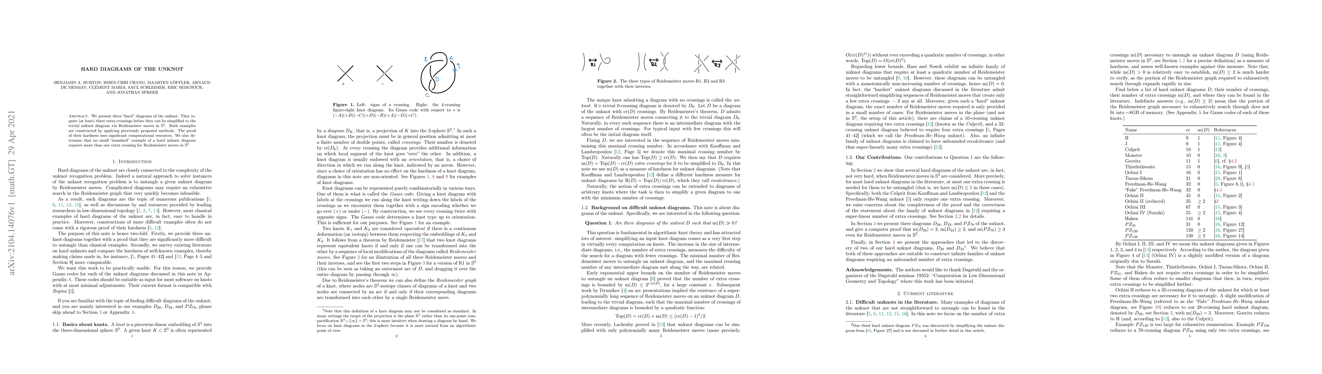 The paper introduces three complex unknot diagrams requiring at least three extra crossings to simplify via Reidemeister moves, demonstrating their computational hardness. It concludes that small hard unknot diagrams typically need no more than one extra crossing.