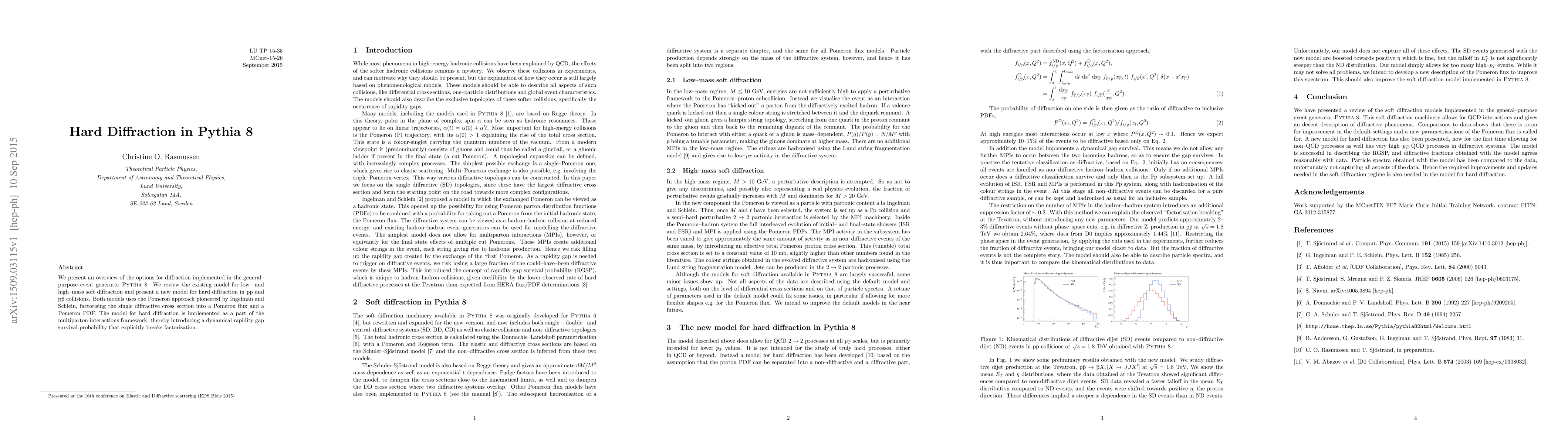 We present an overview of the options for diffraction implemented in the general--purpose event generator Pythia 8. We review the existing model for low-- and high--mass soft diffraction and present a new model for hard diffraction in pp and ppbar collisions. Both models uses the Pomeron approach pioneered by Ingelman and Schlein, factorising the single diffractive cross section into a Pomeron flux and a Pomeron PDF. The model for hard diffraction is implemented as a part of the multiparton interactions framework, thereby introducing a dynamical rapidity gap survival probability that explicitly breaks factorisation.