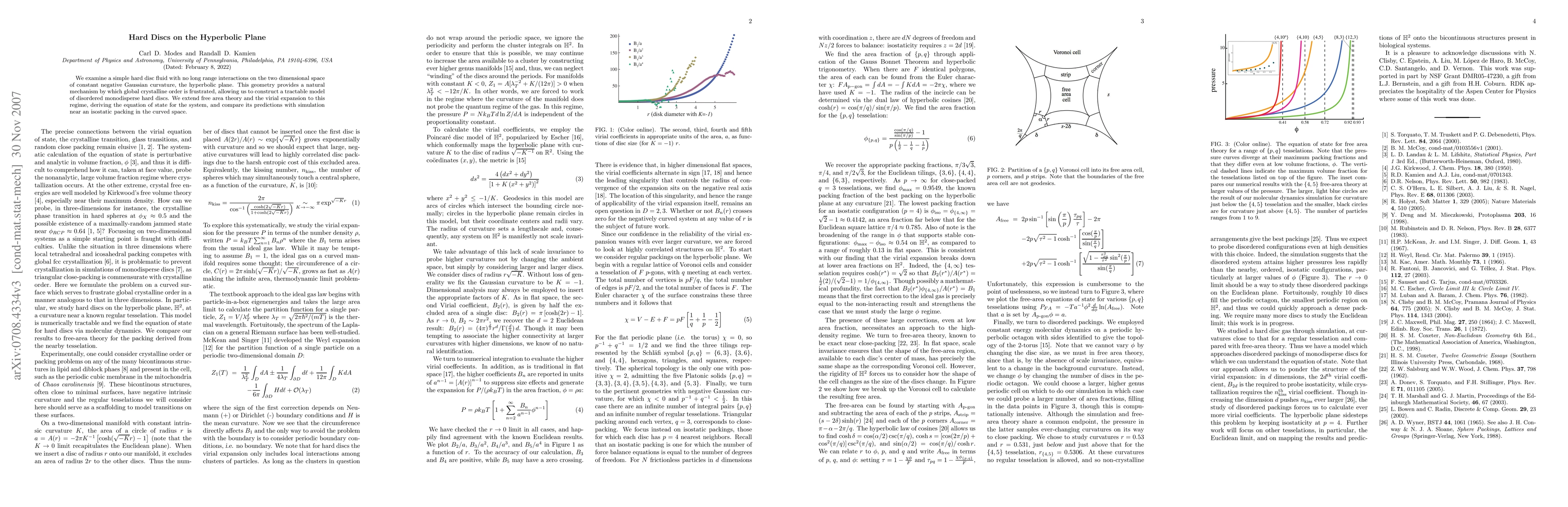 This paper investigates a model of hard disc fluid on the hyperbolic plane, where global crystalline order is naturally frustrated. The authors extend free area theory and the virial expansion to derive the equation of state and compare theoretical predictions with simulations near isostatic packing.
