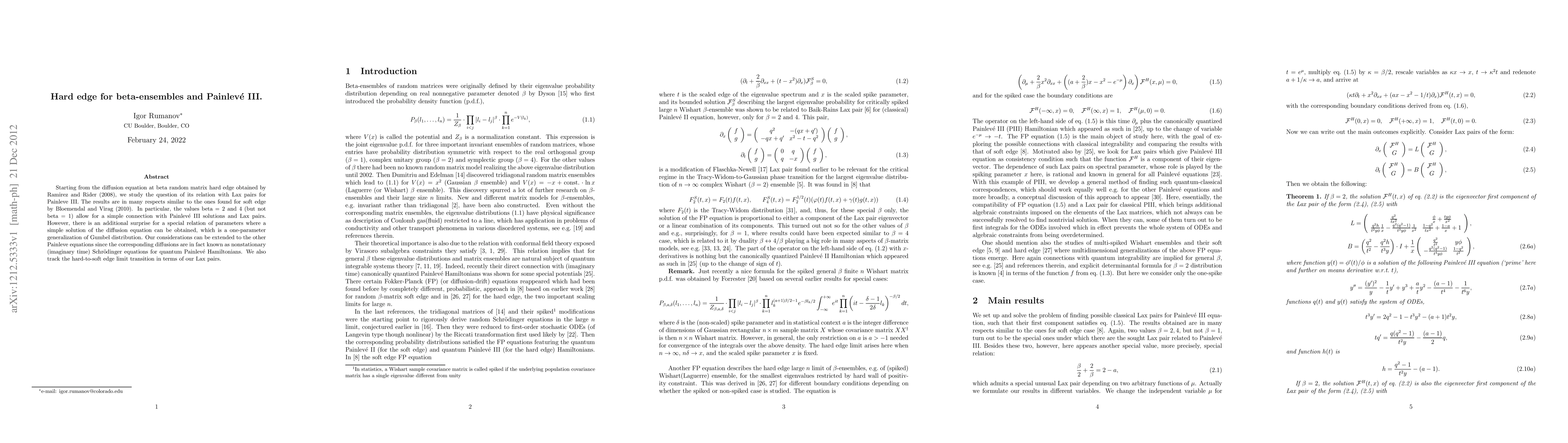 Starting from the diffusion equation at beta random matrix hard edge obtained by Ramirez and Rider (2008), we study the question of its relation with Lax pairs for Painleve III. The results are in many respects similar to the ones found for soft edge by Bloemendal and Virag (2010). In particular, the values beta = 2 and 4 (but not beta = 1) allow for a simple connection with Painlev\'e III solutions and Lax pairs. However, there is an additional surprise for a special relation of parameters where a simple solution of the diffusion equation can be obtained, which is a one-parameter generalization of Gumbel distribution. Our considerations can be extended to the other Painleve equations since the corresponding diffusions are in fact known as nonstationary (imaginary time) Schr\"odinger equations for quantum Painlev\'e Hamiltonians. We also track the hard-to-soft edge limit transition in terms of our Lax pairs.