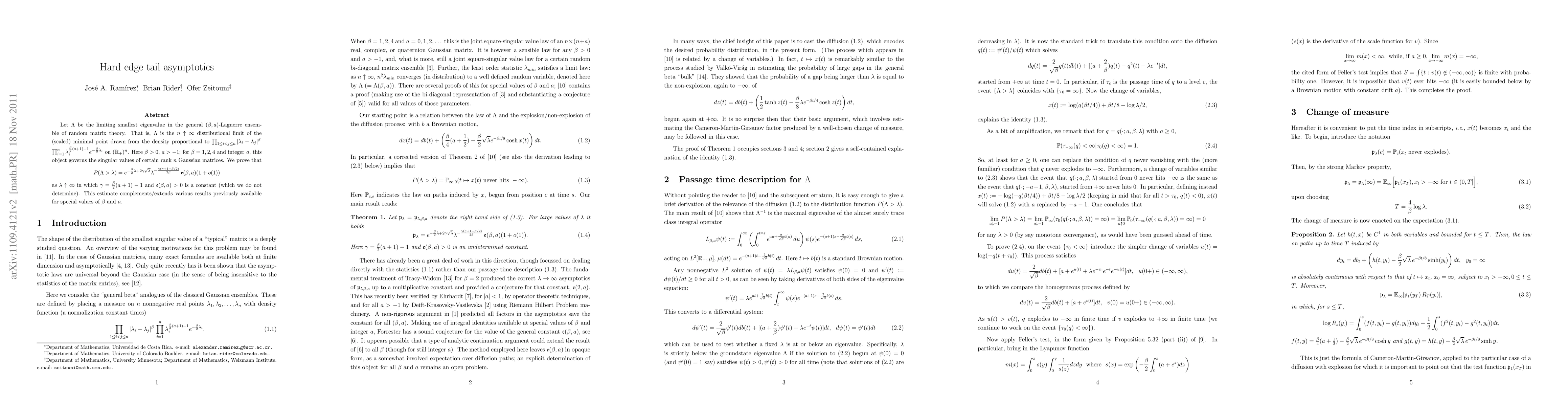 Let $\Lambda$ be the limiting smallest eigenvalue in the general (\beta, a)-Laguerre ensemble of random matrix theory. Here \beta>0, a >-1; for \beta=1,2,4 and integer a, this object governs the singular values of certain rank n Gaussian matrices. We prove that P(\Lambda > \lambda) = e^{- (\beta/2) \lambda + 2 \gamma \lambda^{1/2}} \lambda^{- (\gamma(\gamma+1))/(2\beta) + \gamma/4} E (\beta, a) (1+o(1)) as \lambda goes to infinity, in which \gamma = (\beta/2) (a+1)-1 and E(\beta, a) is a constant (which we do not determine). This estimate complements/extends various results previously available for special values of \beta and a.