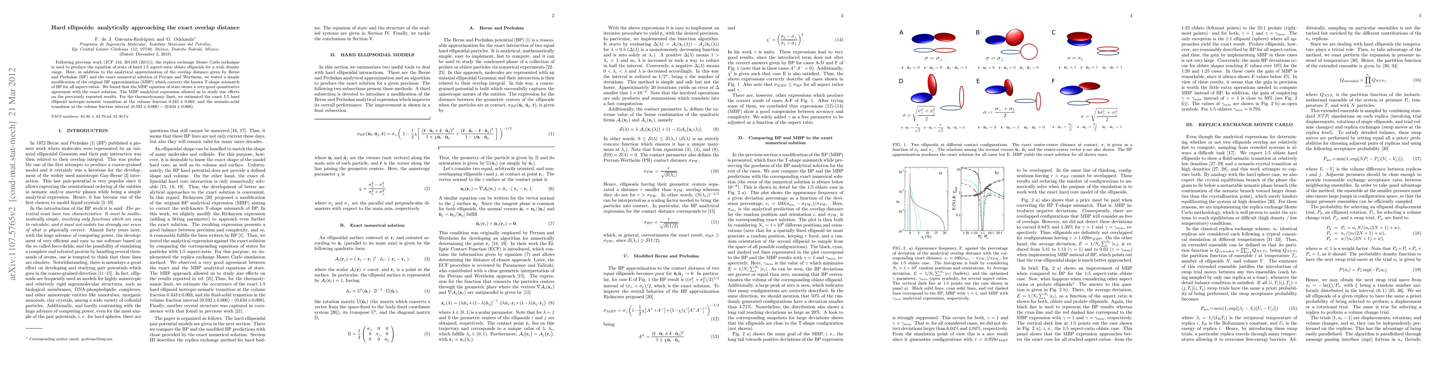 This paper uses replica exchange Monte Carlo to derive the equation of state for hard ellipsoids of 1:5 aspect ratio, comparing the modified Berne and Pechukas (MBP) approximation with exact numerical solutions and identifying MBP's superior accuracy. The study also estimates the isotropic-nematic transition at a volume fraction of 0.343(3) and the nematic-solid transition in the range 0.592(6)-0.634(8).