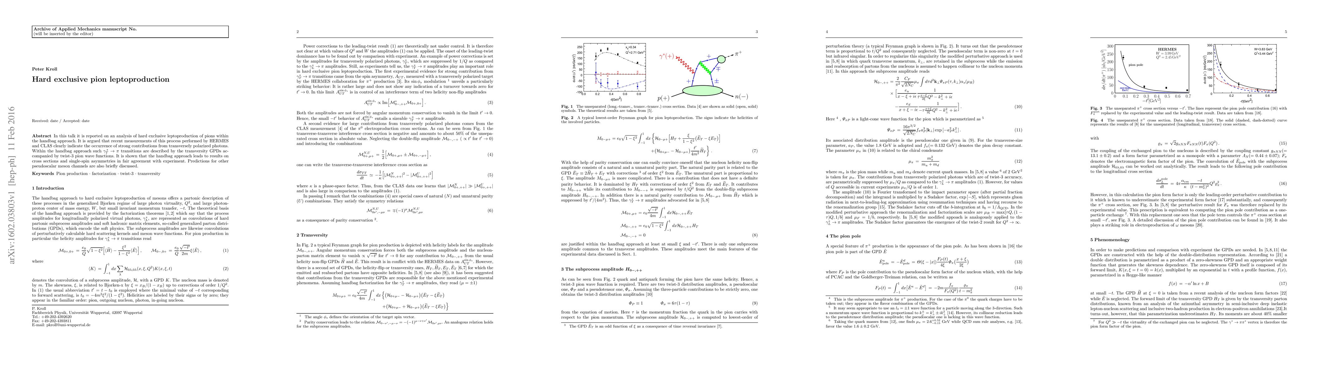 This paper analyzes hard exclusive pion leptoproduction using the handbag approach, demonstrating strong contributions from transversely polarized photons. The study shows good agreement between theoretical predictions and experimental results from HERMES and CLAS, and briefly discusses predictions for other pseudoscalar meson channels.