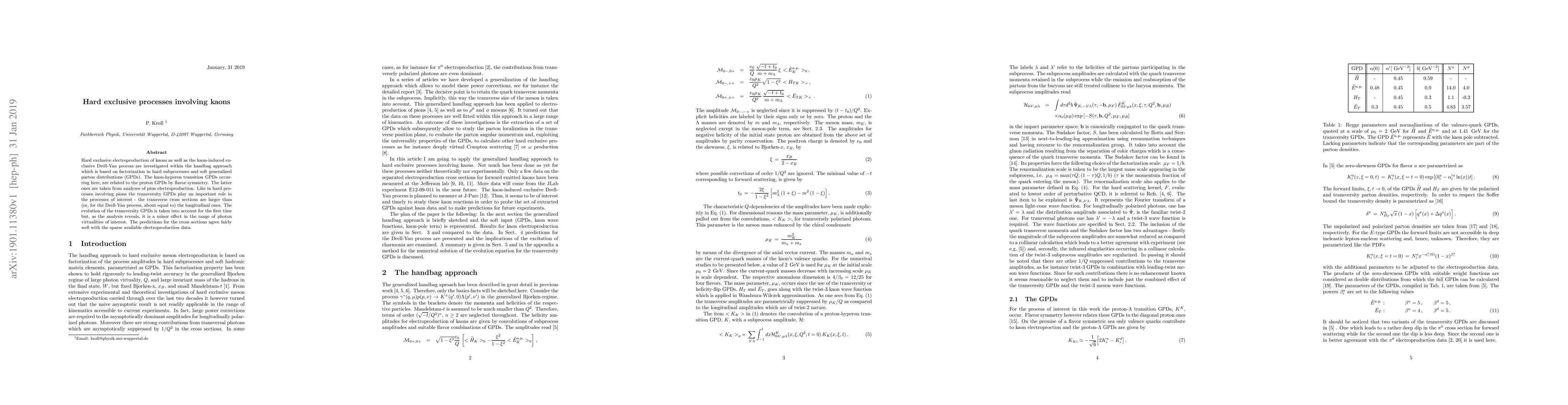 Hard exclusive electroproduction of kaons as well as the kaon-induced exclusive Drell-Yan process are investigated within the handbag approach which is based on factorization in hard subprocesses and soft generalized parton distributions (GPDs). The kaon-hyperon transition GPDs occurring here, are related to the proton GPDs by flavor symmetry. The latter ones are taken from analyses of pion electroproduction. Like in hard processes involving pions the transversity GPDs play an important role in the processes of interest - the transverse cross sections are larger than (or, for the Drell-Yan process, about equal to) the longitudinal ones. The evolution of the transversity GPDs is taken into account for the first time but, as the analysis reveals, it is a minor effect in the range of photon virtualities of interest. The predictions for the cross sections agree fairly well with the sparse available electroproduction data.