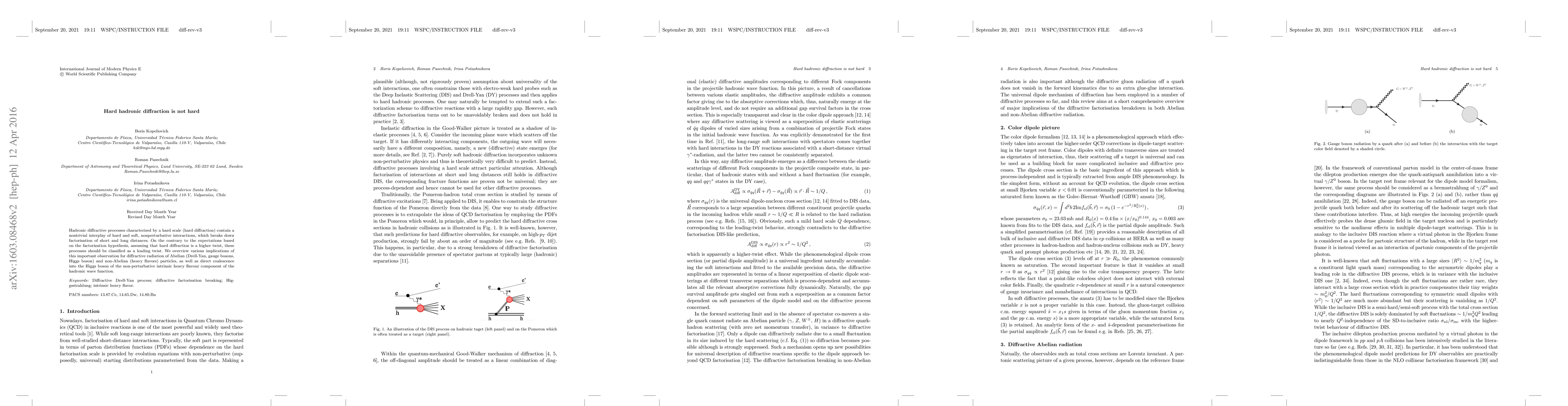 This paper argues that hard hadronic diffraction, contrary to the factorization hypothesis, should be classified as leading twist rather than higher twist, impacting the understanding of diffractive processes for both Abelian and non-Abelian particles. This reclassification has significant implications for diffractive radiation and direct coalescence into the Higgs boson.