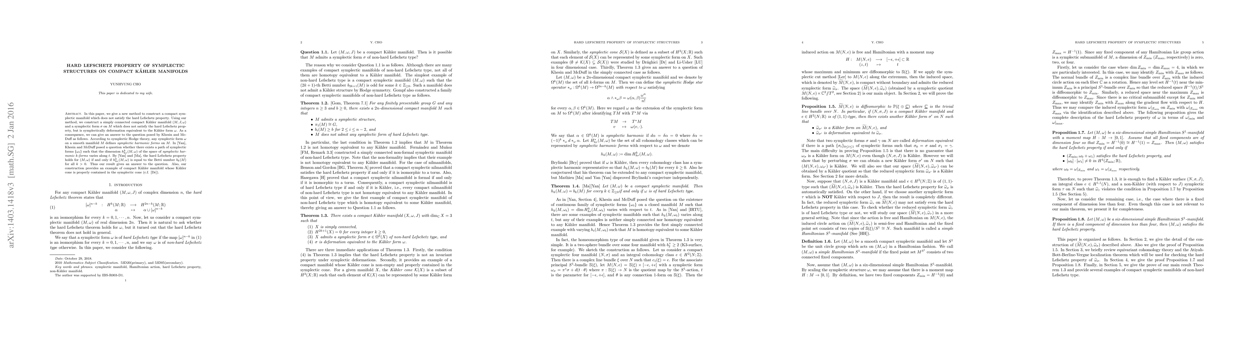 This paper presents a new method to construct a compact symplectic manifold that lacks the hard Lefschetz property, specifically a simply connected compact Kähler manifold with a symplectic form not satisfying this property but deformation equivalent to the original Kähler form. The result answers a question by Khesin and McDuff regarding the variation of dimensions of symplectic harmonic forms along a path of symplectic forms, and also demonstrates that the Kähler cone can be properly contained within the symplectic cone.