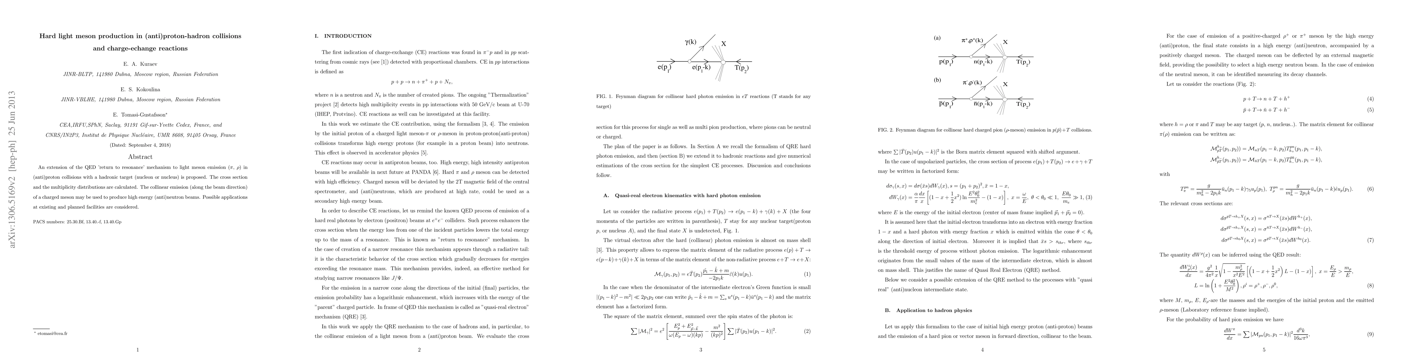 This paper proposes an extension of the QED 'return to resonance' mechanism to predict hard light meson production in (anti)proton-hadron collisions, calculating cross sections and multiplicity distributions. It suggests the potential for generating high-energy (anti)neutron beams via collinear charged meson emission, with applications considered for current and future facilities.