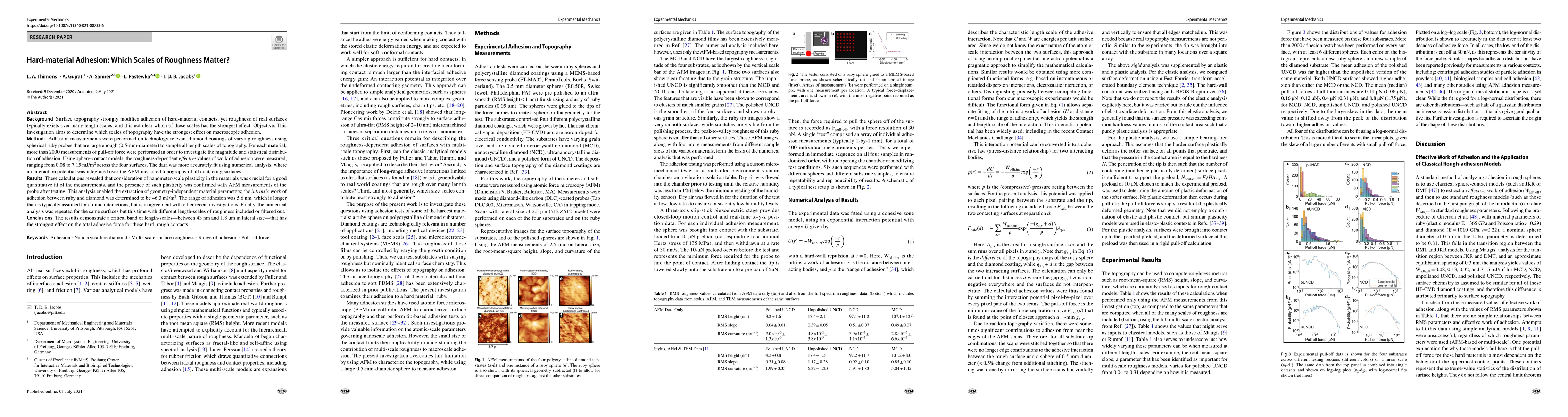 This paper investigates how different scales of surface roughness affect the adhesion of hard materials, finding that the critical band of roughness scales between 43 nm and 1.8 nm significantly influences macroscopic adhesion. The study uses diamond coatings and spherical ruby probes to measure pull-off forces, revealing the importance of nanometer-scale plasticity in achieving accurate quantitative fits.