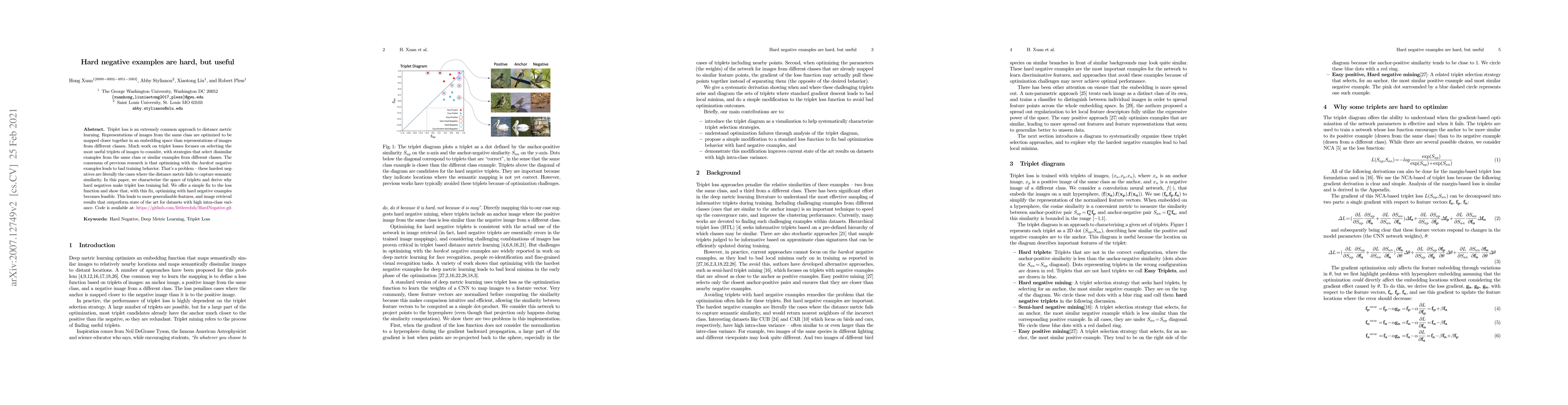 Triplet loss is an extremely common approach to distance metric learning. Representations of images from the same class are optimized to be mapped closer together in an embedding space than representations of images from different classes. Much work on triplet losses focuses on selecting the most useful triplets of images to consider, with strategies that select dissimilar examples from the same class or similar examples from different classes. The consensus of previous research is that optimizing with the \textit{hardest} negative examples leads to bad training behavior. That's a problem -- these hardest negatives are literally the cases where the distance metric fails to capture semantic similarity. In this paper, we characterize the space of triplets and derive why hard negatives make triplet loss training fail. We offer a simple fix to the loss function and show that, with this fix, optimizing with hard negative examples becomes feasible. This leads to more generalizable features, and image retrieval results that outperform state of the art for datasets with high intra-class variance.