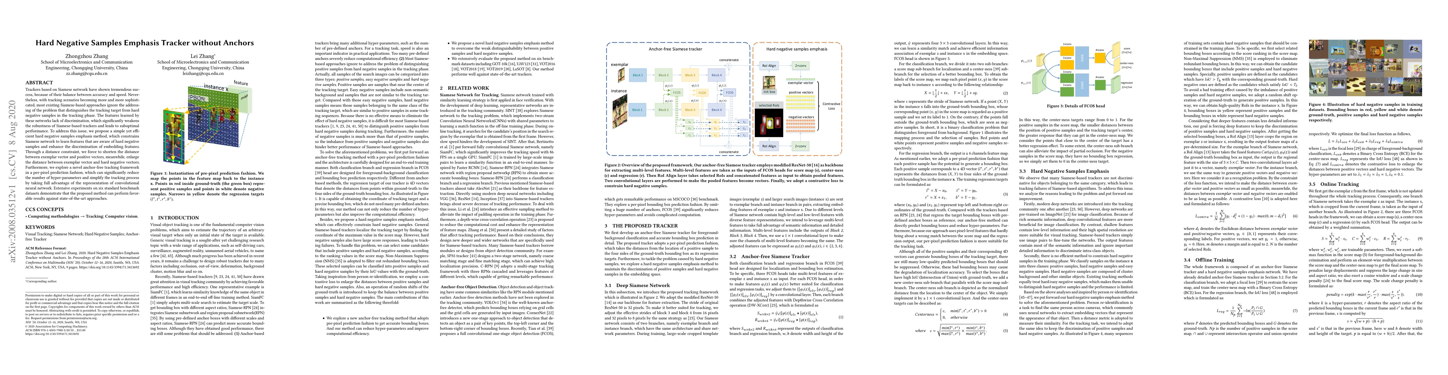Trackers based on Siamese network have shown tremendous success, because of their balance between accuracy and speed. Nevertheless, with tracking scenarios becoming more and more sophisticated, most existing Siamese-based approaches ignore the addressing of the problem that distinguishes the tracking target from hard negative samples in the tracking phase. The features learned by these networks lack of discrimination, which significantly weakens the robustness of Siamese-based trackers and leads to suboptimal performance. To address this issue, we propose a simple yet efficient hard negative samples emphasis method, which constrains Siamese network to learn features that are aware of hard negative samples and enhance the discrimination of embedding features. Through a distance constraint, we force to shorten the distance between exemplar vector and positive vectors, meanwhile, enlarge the distance between exemplar vector and hard negative vectors. Furthermore, we explore a novel anchor-free tracking framework in a per-pixel prediction fashion, which can significantly reduce the number of hyper-parameters and simplify the tracking process by taking full advantage of the representation of convolutional neural network. Extensive experiments on six standard benchmark datasets demonstrate that the proposed method can perform favorable results against state-of-the-art approaches.