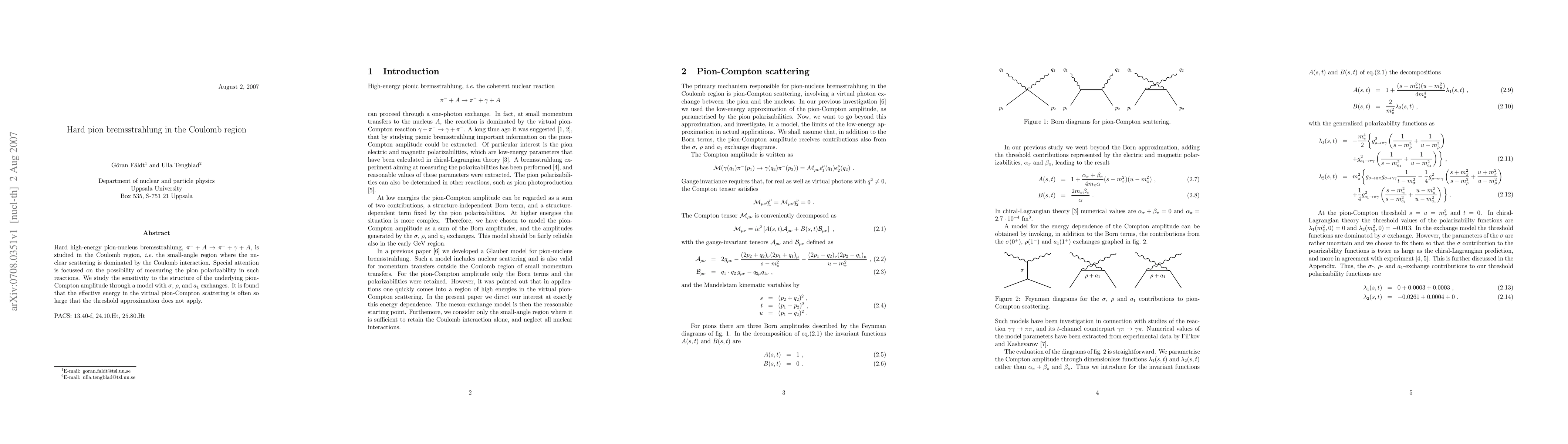 This paper investigates hard pion bremsstrahlung in the Coulomb region, focusing on the potential to measure pion polarizability. It examines the sensitivity of the pion-Compton amplitude to $\sigma$, $\rho$, and $a_1$ meson exchanges, finding that the effective energy often exceeds thresholds for accurate approximations.