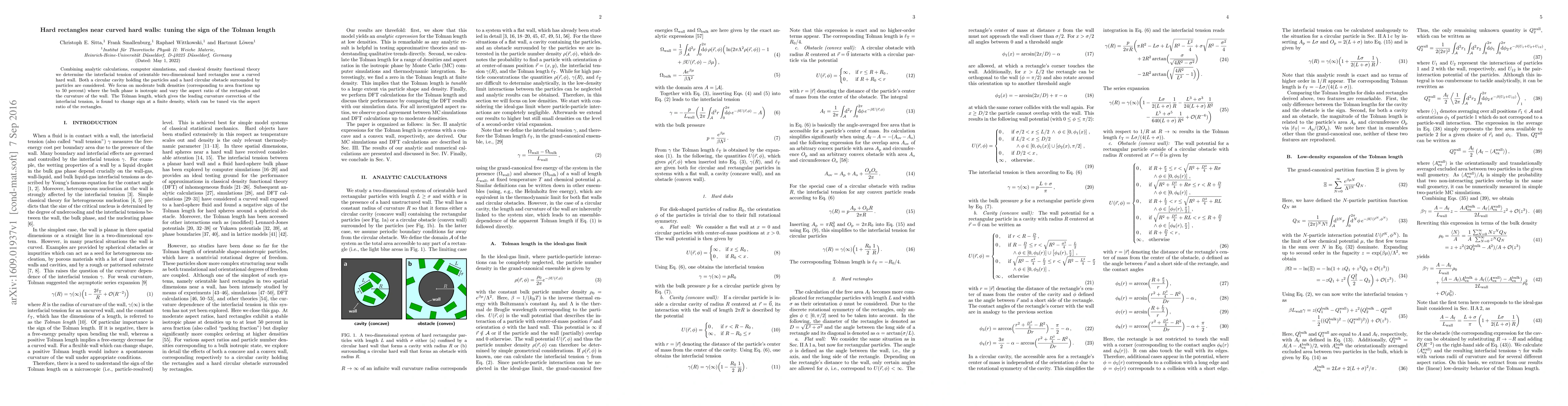 This study combines analytic calculations, simulations, and density functional theory to determine the interfacial tension of hard rectangles near curved hard walls, finding that the Tolman length, which corrects for curvature effects, changes sign at a specific density, tunable by the rectangles' aspect ratio.