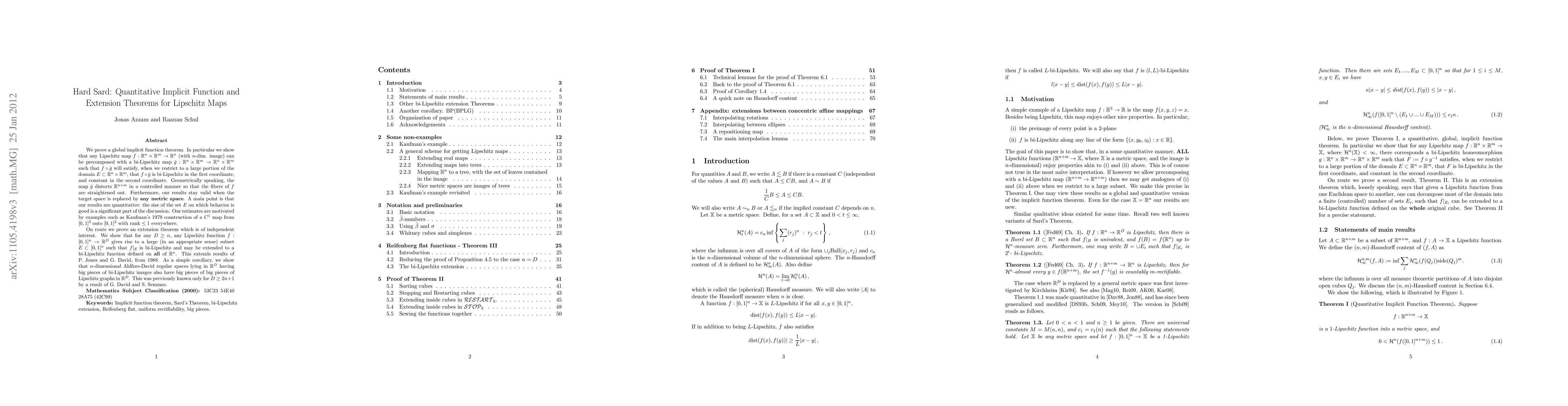 We prove a global implicit function theorem. In particular we show that any Lipschitz map $f:\bR^n\times \bR^m\to\bR^n$ (with $n$-dim. image) can be precomposed with a bi-Lipschitz map $\bar{g}:\bR^n\times \bR^m\to \bR^n\times \bR^m$ such that $f\circ \bar{g}$ will satisfy, when we restrict to a large portion of the domain $E\subset \bR^n\times \bR^m$, that $f\circ \bar{g}$ is bi-Lipschitz in the first coordinate, and constant in the second coordinate. Geometrically speaking, the map $\bar{g}$ distorts $\bR^{n+m}$ in a controlled manner, so that the fibers of $f$ are straightened out. Furthermore, our results stay valid when the target space is replaced by {\bf any metric space}. A main point is that our results are quantitative: the size of the set $E$ on which behavior is good is a significant part of the discussion. Our estimates are motivated by examples such as Kaufman's 1979 construction of a $C^1$ map from $[0,1]^3$ onto $[0,1]^2$ with rank $\leq 1$ everywhere. On route we prove an extension theorem which is of independent interest. We show that for any $D\geq n$, any Lipschitz function $f:[0,1]^n\to \bR^D$ gives rise to a large (in an appropriate sense) subset $E\subset [0,1]^n$ such that $f|_E$ is bi-Lipschitz and may be extended to a bi-Lipschitz function defined on {\bf all} of $\bR^n$. The most interesting case is the case $D=n$. As a simple corollary, we show that $n$-dimensional Ahlfors-David regular spaces lying in $\bR^{D}$ having big pieces of bi-Lipschitz images also have big pieces of big pieces of Lipschitz graphs in $\bR^{D}$. This was previously known only for $D\geq 2n+1$ by a result of G. David and S. Semmes.