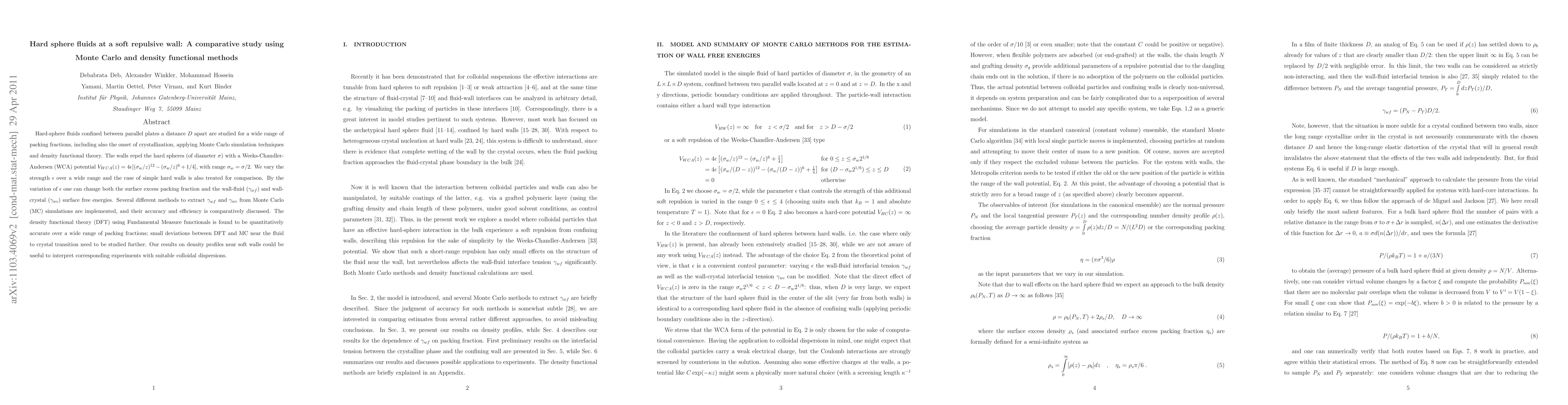 Hard-sphere fluids confined between parallel plates a distance $D$ apart are studied for a wide range of packing fractions, including also the onset of crystallization, applying Monte Carlo simulation techniques and density functional theory. The walls repel the hard spheres (of diameter $\sigma$) with a Weeks-Chandler-Andersen (WCA) potential $V_{WCA}(z) = 4 \epsilon [(\sigma_w/z)^{12}-(\sigma_w/z)^6 + 1/4]$, with range $\sigma_w = \sigma/2$. We vary the strength $\epsilon$ over a wide range and the case of simple hard walls is also treated for comparison. By the variation of $\epsilon$ one can change both the surface excess packing fraction and the wall-fluid $(\gamma_{wf})$ and wall-crystal $(\gamma_{wc})$ surface free energies. Several different methods to extract $\gamma_{wf}$ and $\gamma_{wc}$ from Monte Carlo (MC) simulations are implemented, and their accuracy and efficiency is comparatively discussed. The density functional theory (DFT) using Fundamental Measure functionals is found to be quantitatively accurate over a wide range of packing fractions; small deviations between DFT and MC near the fluid to crystal transition need to be studied further. Our results on density profiles near soft walls could be useful to interpret corresponding experiments with suitable colloidal dispersions.