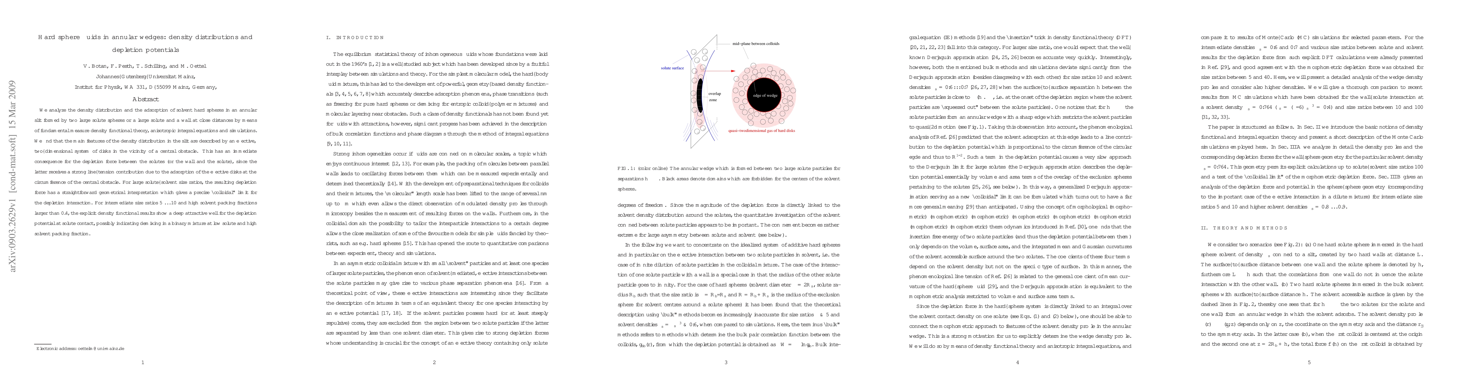 We analyze the density distribution and the adsorption of solvent hard spheres in an annular slit formed by two large solute spheres or a large solute and a wall at close distances by means of fundamental measure density functional theory, anisotropic integral equations and simulations. We find that the main features of the density distribution in the slit are described by an effective, two--dimensional system of disks in the vicinity of a central obstacle. For large solute--solvent size ratios, the resulting depletion force has a straightforward geometrical interpretation which gives a precise "colloidal" limit for the depletion interaction. For intermediate size ratios 5...10 and high solvent packing fractions larger than 0.4, the explicit density functional results show a deep attractive well for the depletion potential at solute contact, possibly indicating demixing in a binary mixture at low solute and high solvent packing fraction.