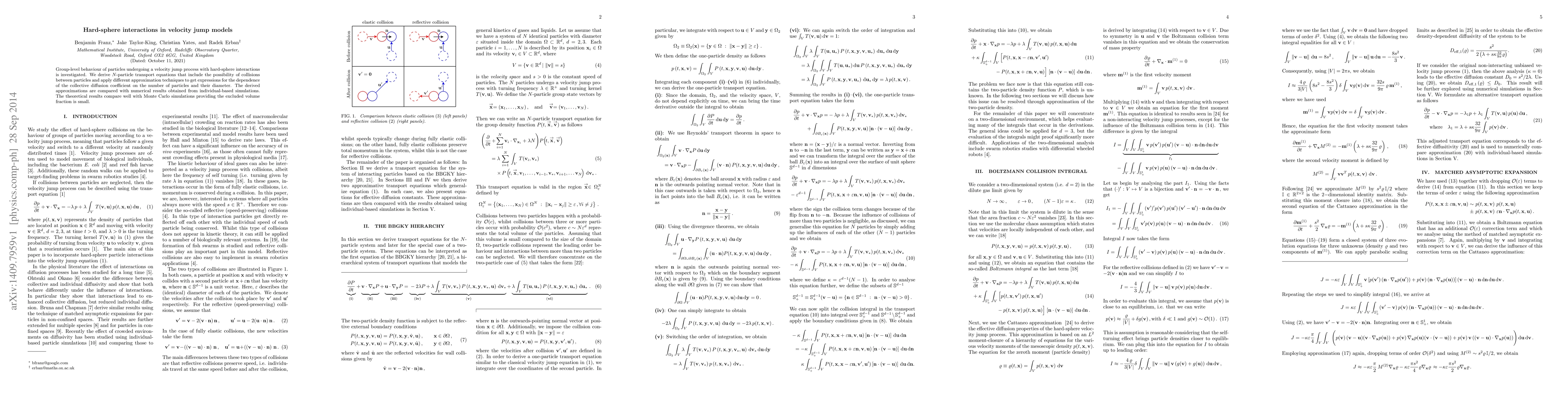 Group-level behaviour of particles undergoing a velocity jump process with hard-sphere interactions is investigated. We derive $N$-particle transport equations that include the possibility of collisions between particles and apply different approximation techniques to get expressions for the dependence of the collective diffusion coefficient on the number of particles and their diameter. The derived approximations are compared with numerical results obtained from individual-based simulations. The theoretical results compare well with Monte Carlo simulations providing the excluded volume fraction is small.
