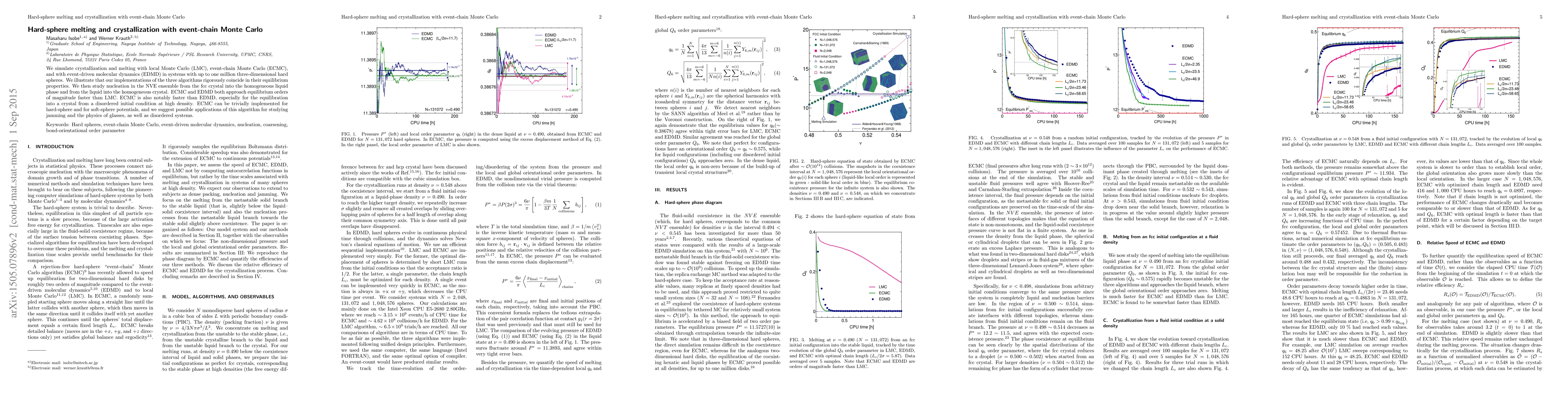 We simulate crystallization and melting with local Monte Carlo (LMC), event-chain Monte Carlo (ECMC), and with event-driven molecular dynamics (EDMD) in systems with up to one million three-dimensional hard spheres. We illustrate that our implementations of the three algorithms rigorously coincide in their equilibrium properties. We then study nucleation in the NVE ensemble from the fcc crystal into the homogeneous liquid phase and from the liquid into the homogeneous crystal. ECMC and EDMD both approach equilibrium orders of magnitude faster than LMC. ECMC is also notably faster than EDMD, especially for the equilibration into a crystal from a disordered initial condition at high density. ECMC can be trivially implemented for hard-sphere and for soft-sphere potentials, and we suggest possible applications of this algorithm for studying jamming and the physics of glasses, as well as disordered systems.