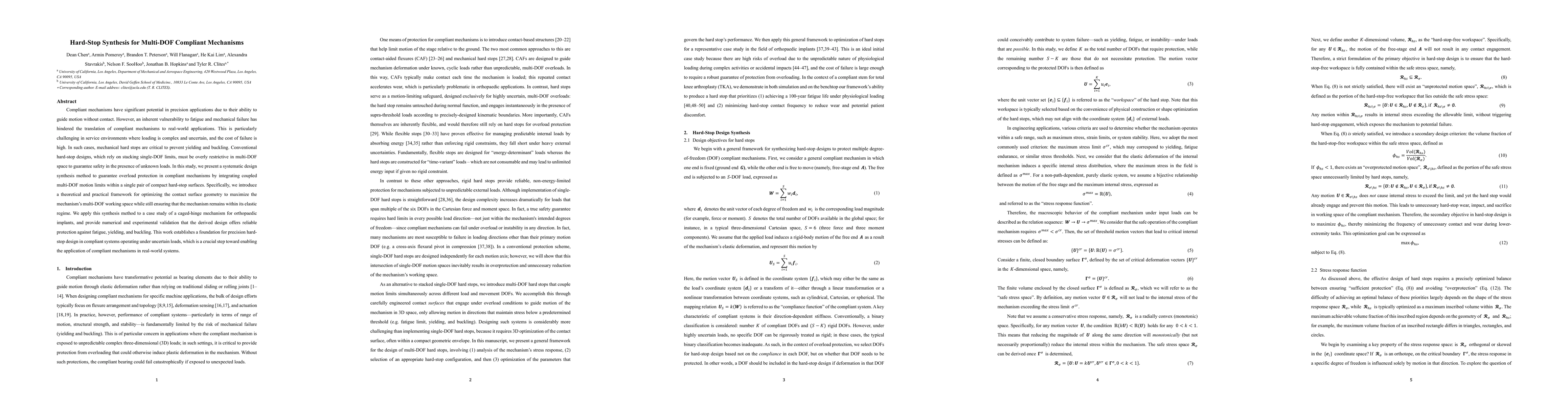 Compliant mechanisms have significant potential in precision applications due to their ability to guide motion without contact. However, an inherent vulnerability to fatigue and mechanical failure has hindered the translation of compliant mechanisms to real-world applications. This is particularly challenging in service environments where loading is complex and uncertain, and the cost of failure is high. In such cases, mechanical hard stops are critical to prevent yielding and buckling. Conventional hard-stop designs, which rely on stacking single-DOF limits, must be overly restrictive in multi-DOF space to guarantee safety in the presence of unknown loads. In this study, we present a systematic design synthesis method to guarantee overload protection in compliant mechanisms by integrating coupled multi-DOF motion limits within a single pair of compact hard-stop surfaces. Specifically, we introduce a theoretical and practical framework for optimizing the contact surface geometry to maximize the mechanisms multi-DOF working space while still ensuring that the mechanism remains within its elastic regime. We apply this synthesis method to a case study of a caged-hinge mechanism for orthopaedic implants, and provide numerical and experimental validation that the derived design offers reliable protection against fatigue, yielding, and buckling. This work establishes a foundation for precision hard-stop design in compliant systems operating under uncertain loads, which is a crucial step toward enabling the application of compliant mechanisms in real-world systems.
