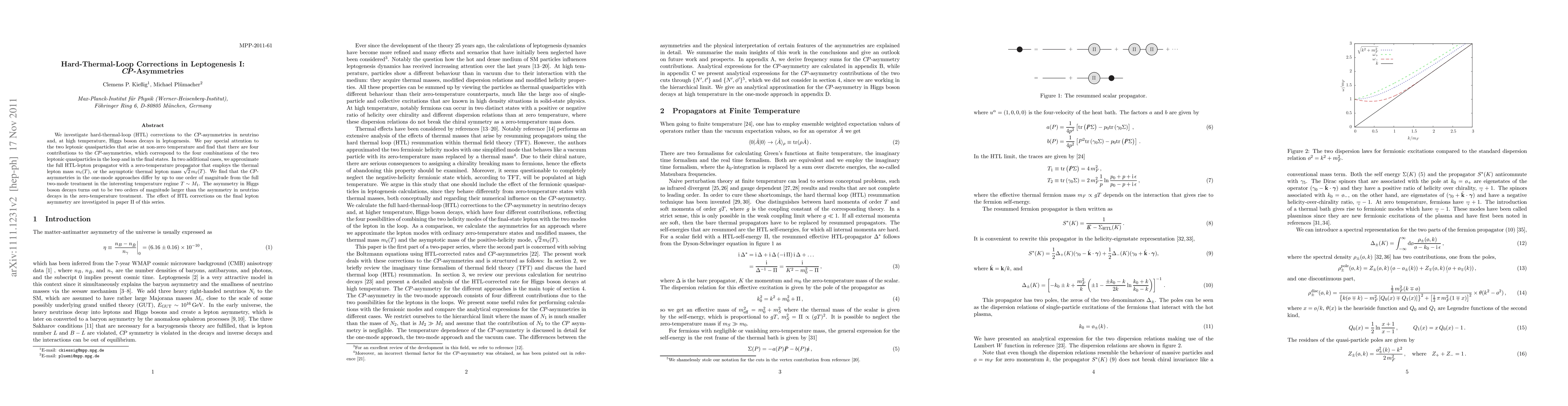 We investigate hard-thermal-loop (HTL) corrections to the CP-asymmetries in neutrino and, at high temperature, Higgs boson decays in leptogenesis. We pay special attention to the two leptonic quasiparticles that arise at non-zero temperature and find that there are four contributions to the CP-asymmetries, which correspond to the four combinations of the two leptonic quasiparticles in the loop and in the final states. In two additional cases, we approximate the full HTL-lepton propagator with a zero-temperature propagator that employs the thermal lepton mass m_l(T), or the asymptotic thermal lepton mass sqrt{2} m_l(T). We find that the CP-asymmetries in the one-mode approaches differ by up to one order of magnitude from the full two-mode treatment in the interesting temperature regime T \sim M_1. The asymmetry in Higgs boson decays turns out to be two orders of magnitude larger than the asymmetry in neutrino decays in the zero-temperature treatment. The effect of HTL corrections on the final lepton asymmetry are investigated in paper II of this series.