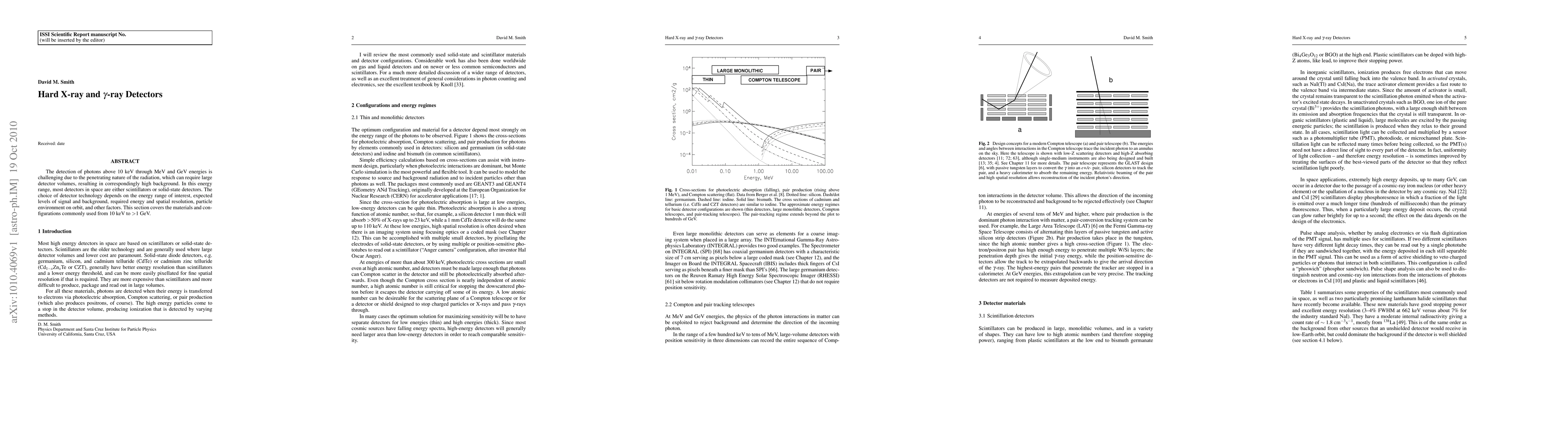 The detection of photons above 10 keV through MeV and GeV energies is challenging due to the penetrating nature of the radiation, which can require large detector volumes, resulting in correspondingly high background. In this energy range, most detectors in space are either scintillators or solid-state detectors. The choice of detector technology depends on the energy range of interest, expected levels of signal and background, required energy and spatial resolution, particle environment on orbit, and other factors. This section covers the materials and configurations commonly used from 10 keV to > 1 GeV.