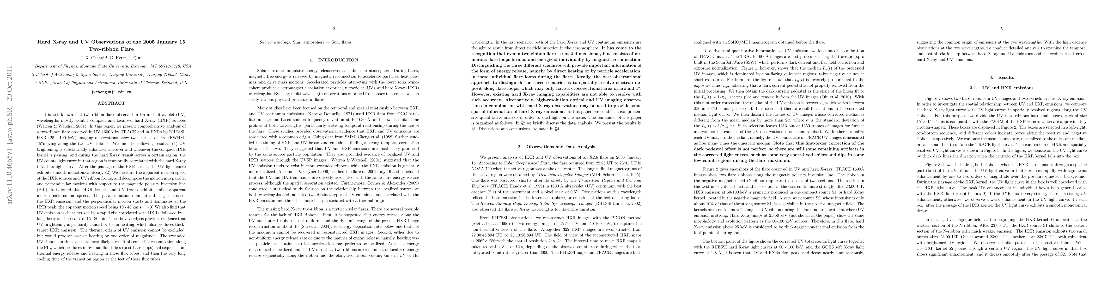 In this paper, we present comprehensive analysis of a two-ribbon flare observed in UV 1600{\AA} by Transition Region and Coronal Explorer and in HXRs by Reuven Ramaty High Energy Solar Spectroscopic Imager. HXR (25-100 keV) imaging observations show two kernels of size (FWHM) 15?? moving along the two UV ribbons. We find the following results. (1) UV brightening is substantially enhanced wherever and whenever the compact HXR kernel is passing, and during the HXR transit across a certain region, the UV count light curve in that region is temporally correlated with the HXR total flux light curve. After the passage of the HXR kernel, the UV light curve exhibits smooth monotonical decay. (2)We measure the apparent motion speed of the HXR sources and UV ribbon fronts, and decompose the motion into parallel and perpendicular motions with respect to the magnetic polarity inversion line (PIL). It is found that HXR kernels and UV fronts exhibit similar apparent motion patterns and speeds. The parallel motion dominates during the rise of the HXR emission, and the perpendicular motion starts and dominates at the HXR peak, the apparent motion speed being 10-40 km s-1. (3) We also find that UV emission is characterized by a rapid rise correlated with HXRs, followed by a long decay on timescales of 15-30 minutes. The above analysis provides evidence that UV brightening is primarily caused by beam heating, which also produces thick-target HXR emission. The thermal origin of UV emission cannot be excluded, but would produce weaker heating by one order of magnitude. The extended UV ribbons in this event are most likely a result of sequential reconnection along the PIL, which produces individual flux tubes (post-flare loops), subsequent non-thermal energy release and heating in these flux tubes, and then the very long cooling time of the transition region at the feet of these flux tubes.