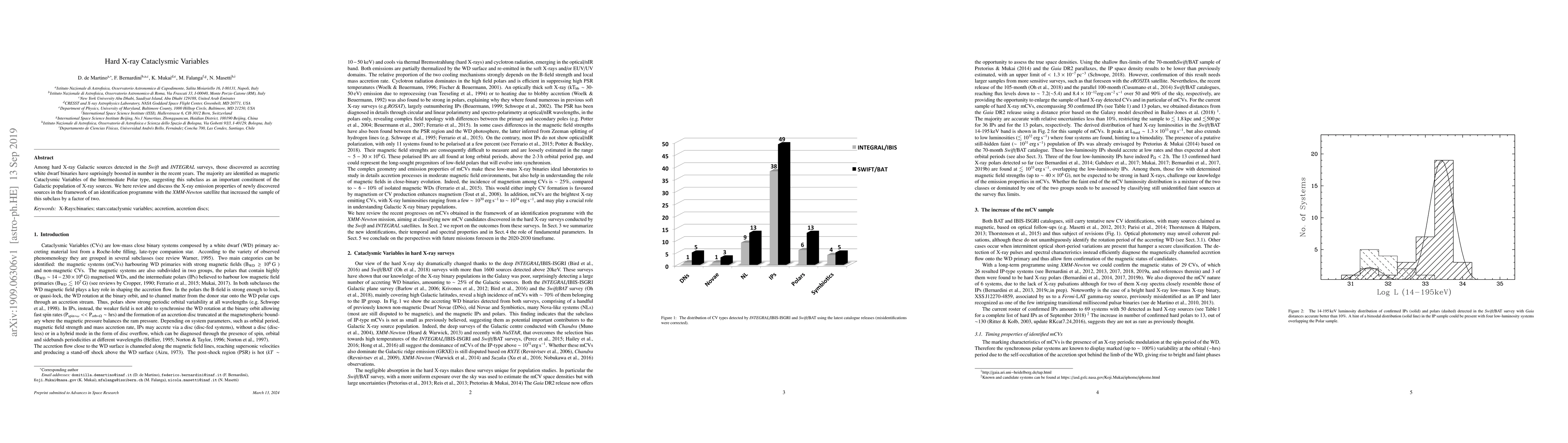 Among hard X-ray Galactic sources detected in the Swift and INTEGRAL surveys, those discovered as accreting white dwarf binaries have suprisingly boosted in number in the recent years. The majority are identified as magnetic Cataclysmic Variables of the Intermediate Polar type, suggesting this subclass as an important constituent of the Galactic population of X-ray sources. We here review and discuss the X-ray emission properties of newly discovered sources in the framework of an identification programme with the XMM-Newton satellite that increased the sample of this subclass by a factor of two.