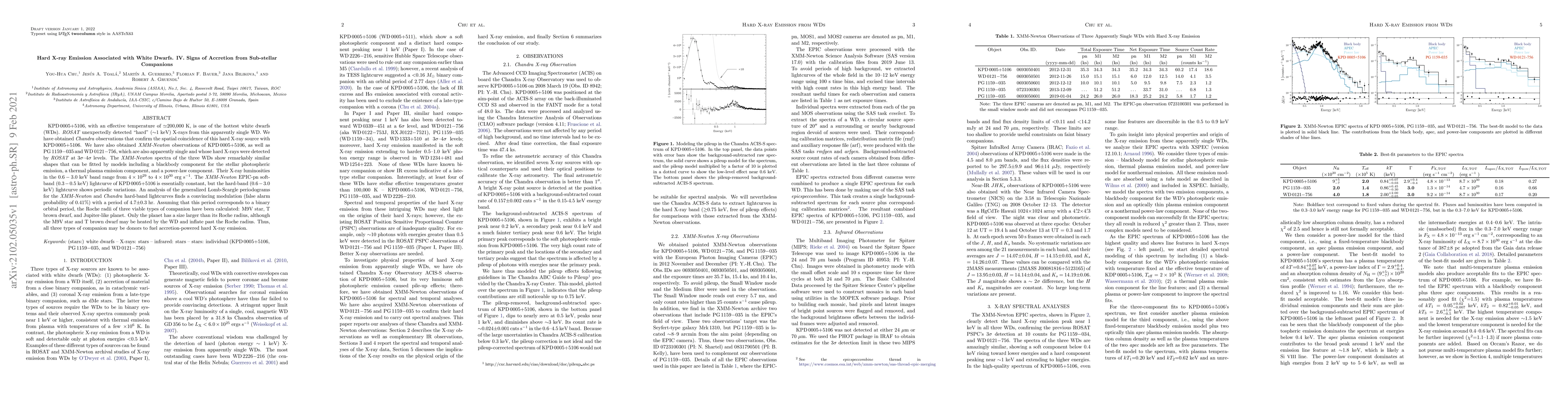 KPD 0005+5106, with an effective temperature of $\simeq$200,000 K, is one of the hottest white dwarfs (WDs). ROSAT unexpectedly detected "hard" ($\sim$1 keV) X-rays from this apparently single WD. We have obtained Chandra observations that confirm the spatial coincidence of this hard X-ray source with KPD 0005+5106. We have also obtained XMM-Newton observations of KPD 0005+5106, as well as PG 1159$-$035 and WD 0121$-$756, which are also apparently single and whose hard X-rays were detected by ROSAT at 3$\sigma$-4$\sigma$ levels. The XMM-Newton spectra of the three WDs show remarkably similar shapes that can be fitted by models including a blackbody component for the stellar photospheric emission, a thermal plasma emission component, and a power-law component. Their X-ray luminosities in the $0.6-3.0$ keV band range from $4\times10^{29}$ to $4\times10^{30}$ erg~s$^{-1}$. The XMM-Newton EPIC-pn soft-band ($0.3-0.5$ keV) lightcurve of KPD 0005+5106 is essentially constant, but the hard-band ($0.6-3.0$ keV) lightcurve shows periodic variations. An analysis of the generalized Lomb-Scargle periodograms for the XMM-Newton and Chandra hard-band lightcurves finds a convincing modulation (false alarm probability of 0.41%) with a period of 4.7$\pm$0.3 hr. Assuming that this period corresponds to a binary orbital period, the Roche radii of three viable types of companion have been calculated: M9V star, T brown dwarf, and Jupiter-like planet. Only the planet has a size larger than its Roche radius, although the M9V star and T brown dwarf may be heated by the WD and inflate past the Roche radius. Thus, all three types of companion may be donors to fuel accretion-powered hard X-ray emission.
