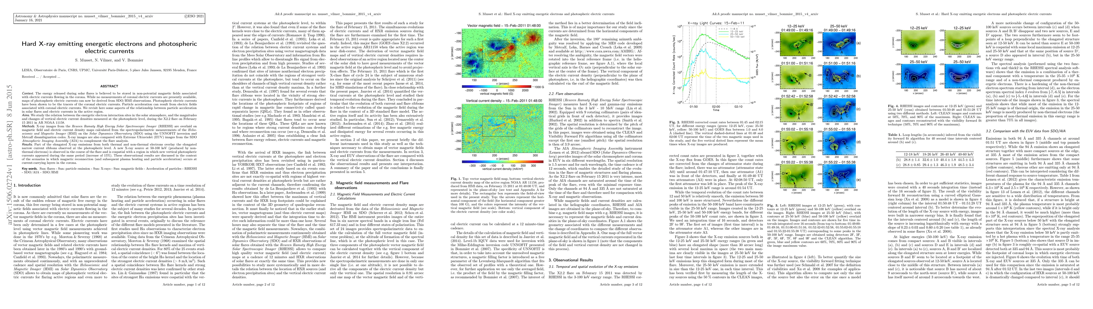 The energy released during solar flares is believed to be stored in non-potential magnetic fields associated with electric currents flowing in the corona. While no measurements of coronal electric currents are presently available, maps of photospheric electric currents can now be derived from SDO/HMI observations. Photospheric electric currents have been shown to be the tracers of the coronal electric currents. Particle acceleration can result from electric fields associated with coronal electric currents. We revisit here some aspects of the relationship between particle acceleration in solar flares and electric currents in the active region. We study the relation between the energetic electron interaction sites in the solar atmosphere, and the magnitudes and changes of vertical electric current densities measured at the photospheric level, during the X2.2 flare on February 15 2011 in AR NOAA 11158. X-ray images from RHESSI are overlaid on magnetic field and electric current density maps calculated from the spectropolarimetric measurements of SDO/HMI using the UNNOFIT inversion and Metcalf disambiguation codes. X-ray images are also compared with EUV images from SDO/AIA to complement the flare analysis. Part of the elongated X-ray emissions from both thermal and non-thermal electrons overlay the elongated narrow current ribbons observed at the photospheric level. A new X-ray source at 50-100 keV (produced by non-thermal electrons) is observed in the course of the flare and is cospatial with a region in which new vertical photospheric currents appeared during the same period (increase of 15%). These observational results are discussed in the context of the scenarios in which magnetic reconnection (and subsequent plasma heating and particle acceleration) occurs at current-carrying layers in the corona.