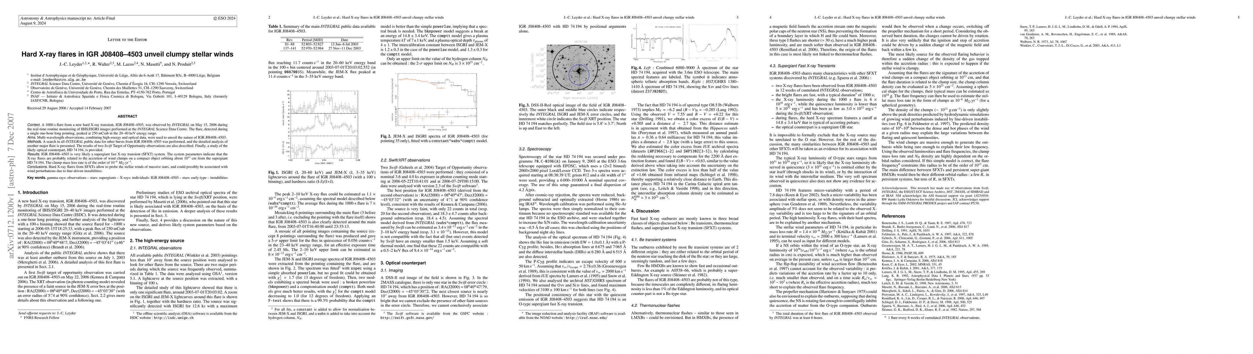 Context : A 1000-s flare from a new hard X-ray transient, IGR J08408-4503, was observed by INTEGRAL on May 15, 2006 during the real-time routine monitoring of IBIS/ISGRI images performed at the INTEGRAL Science Data Centre. The flare, detected during a single one-hour long pointing, peaked at 250 mCrab in the 20-40 keV energy range. Aims : Multi-wavelength observations, combining high-energy and optical data, were used to unveil the nature of IGR J08408-4503. Methods : A search in all INTEGRAL public data for other bursts from IGR J08408-4503 was performed, and the detailed analysis of another major flare is presented. The results of two Swift Target of Opportunity observations are also described. Finally, a study of the likely optical counterpart, HD 74194, is provided. Results : IGR J08408-4503 is very likely a supergiant fast X-ray transient (SFXT) system. The system parameters indicate that the X-ray flares are probably related to the accretion of wind clumps on a compact object orbiting about 1E13 cm from the supergiant HD 74194. The clump mass loss rate is of the order of 1E-6 solar mass/yr. Conclusions : Hard X-ray flares from SFXTs allow to probe the stellar winds of massive stars, and could possibly be associated with wind perturbations due to line-driven instabilities.