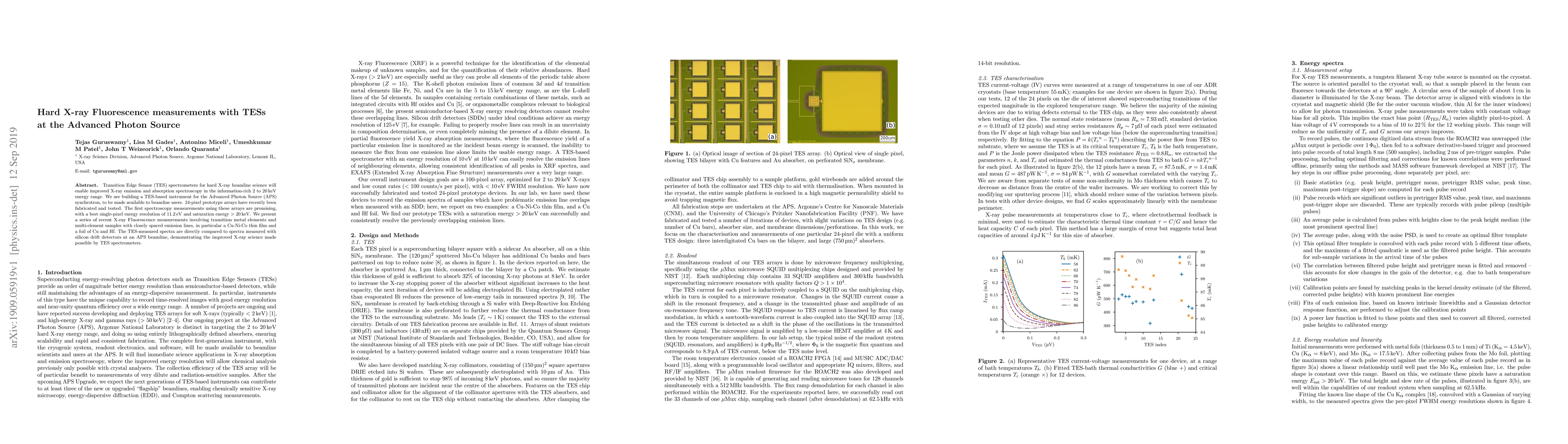 Transition Edge Sensor (TES) spectrometers for hard X-ray beamline science will enable improved X-ray emission and absorption spectroscopy in the information-rich 2 to 20 keV energy range. We are building a TES-based instrument for the Advanced Photon Source (APS) synchrotron, to be made available to beamline users. 24-pixel prototype arrays have recently been fabricated and tested. The first spectroscopy measurements using these arrays are promising, with a best single-pixel energy resolution of 11.2 eV and saturation energy > 20 keV. We present a series of recent X-ray Fluorescence measurements involving transition metal elements and multi-element samples with closely spaced emission lines, in particular a Cu-Ni-Co thin film and a foil of Cu and Hf. The TES-measured spectra are directly compared to spectra measured with silicon drift detectors at an APS beamline, demonstrating the improved X-ray science made possible by TES spectrometers.