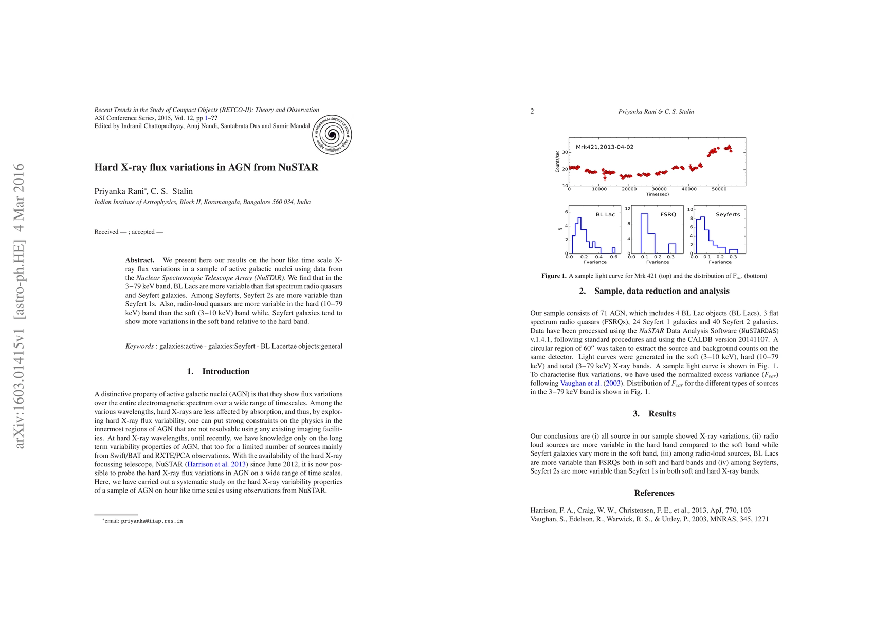We present here our results on the hour like time scale X-ray flux variations in a sample of active galactic nuclei using data from the Nuclear Spectroscopic Telescope Array (NuSTAR). We find that in the 3-79 keV band, BL Lacs are more variable than flat spectrum radio quasars and Seyfert galaxies. Among Seyferts, Seyfert 2s are more variable than Seyfert 1s. Also, radio-loud quasars are more variable in the hard (10-79 keV) band than the soft (3-10 keV) band while, Seyfert galaxies tend to show more variations in the soft band relative to the hard band.