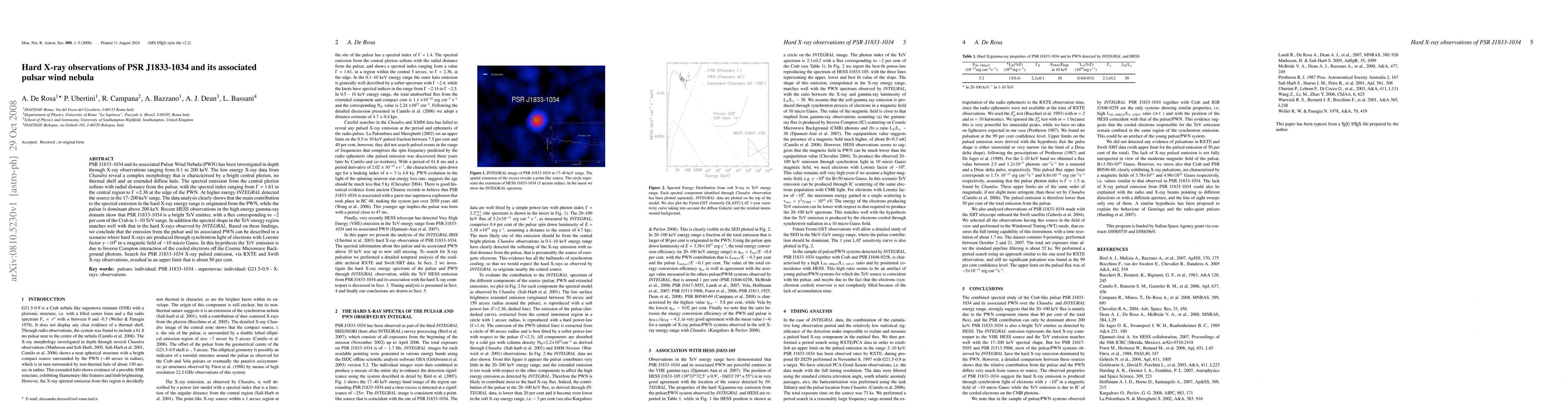 Researchers studied PSR J1833-1034's pulsar wind nebula with X-ray observations, finding hard X-rays produced through synchrotron light of electrons in a magnetic field. The TeV emission is due to Inverse Compton interaction with Cosmic Microwave Background photons.