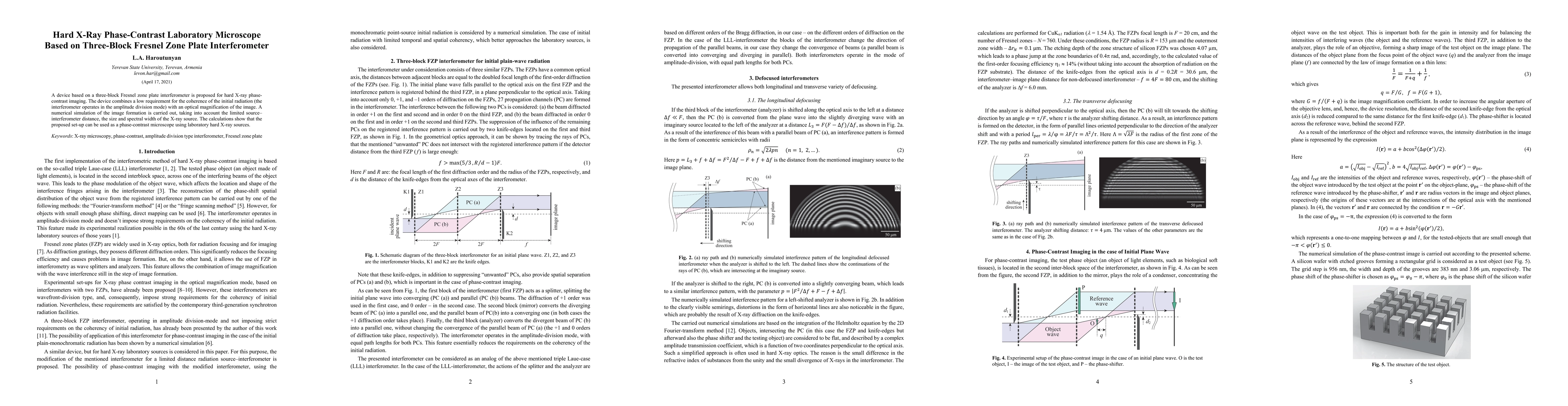 This paper proposes a three-block Fresnel zone plate interferometer for hard X-ray phase-contrast imaging, which requires low coherence of the initial radiation and provides optical magnification. Numerical simulations confirm its potential as a feasible phase-contrast microscope using laboratory hard X-ray sources.