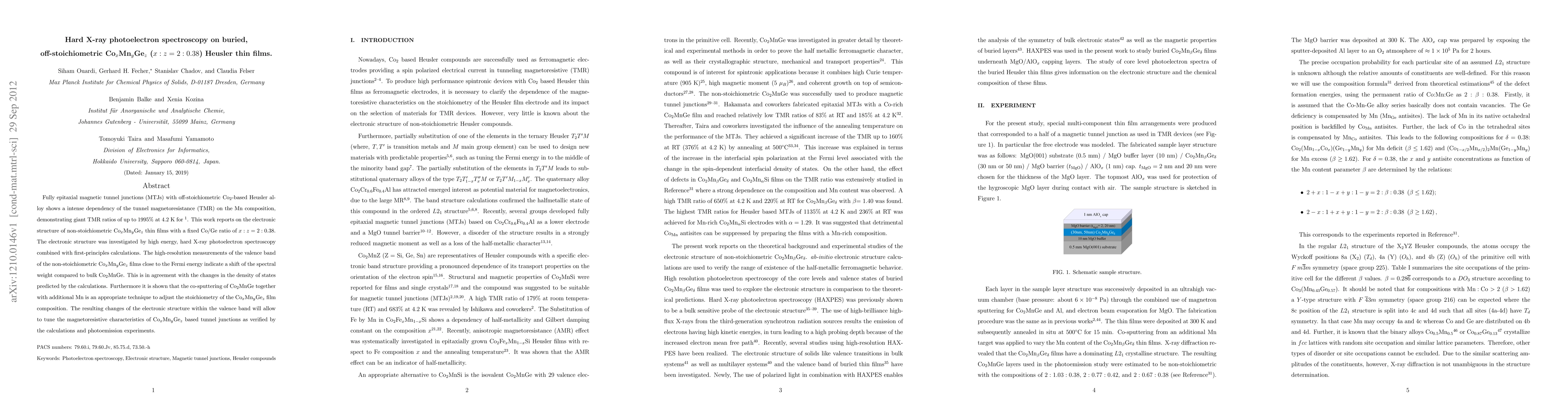 This study investigates the electronic structure of buried, off-stoichiometric CoxMnyGez Heusler thin films using hard X-ray photoelectron spectroscopy and first-principles calculations. The findings reveal shifts in the valence band spectral weight and density of states, correlating with the Mn composition, which can be tuned via the co-sputtering technique to optimize magnetoresistive properties in magnetic tunnel junctions.