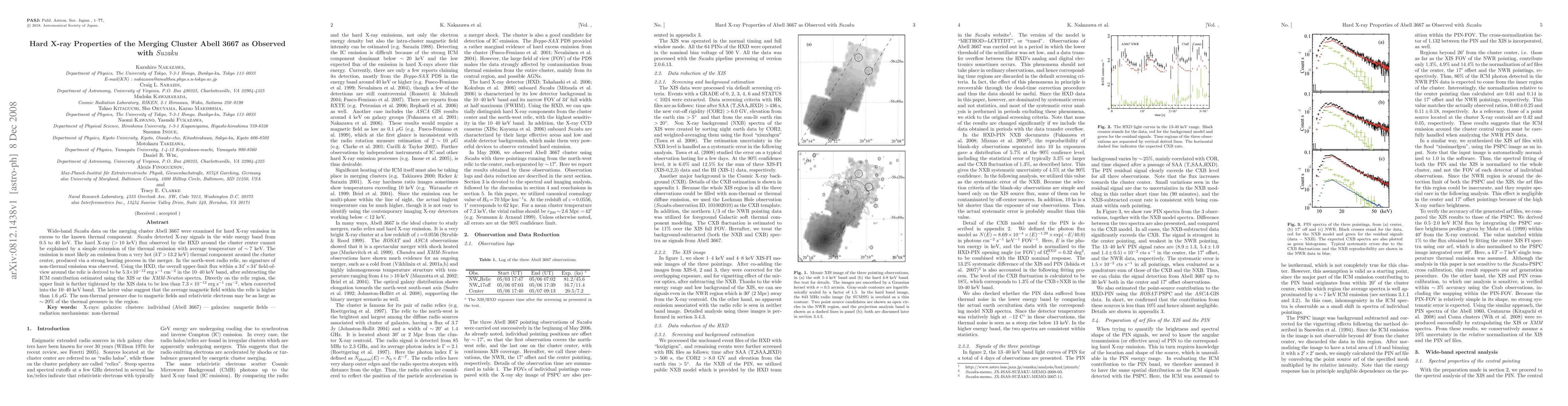 Suzaku observations of the merging cluster Abell 3667 revealed hard X-ray emission exceeding the thermal component, indicating a very hot thermal component in the cluster center. No non-thermal emission was detected in the north-west radio relic, suggesting a high magnetic field.