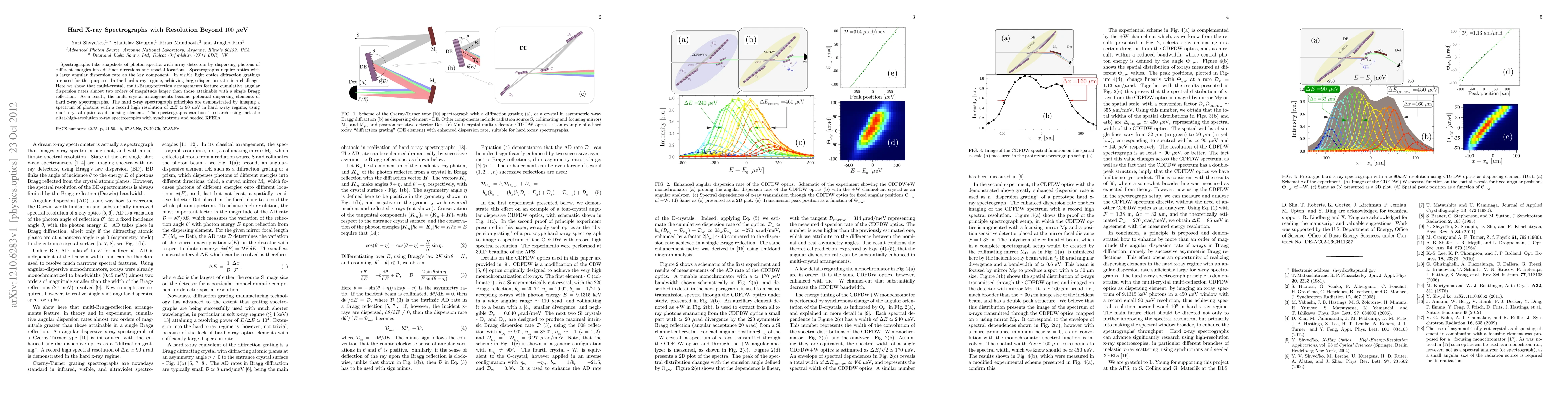 Spectrographs take snapshots of photon spectra with array detectors by dispersing photons of different energies into distinct directions and spacial locations. Spectrographs require optics with a large angular dispersion rate as the key component. In visible light optics diffraction gratings are used for this purpose. In the hard x-ray regime, achieving large dispersion rates is a challenge. Here we show that multi-crystal, multi-Bragg-reflection arrangements feature cumulative angular dispersion rates almost two orders of magnitude larger than those attainable with a single Bragg reflection. As a result, the multi-crystal arrangements become potential dispersing elements of hard x-ray spectrographs. The hard x-ray spectrograph principles are demonstrated by imaging a spectrum of photons with a record high resolution of $\Delta E \simeq 90 \mu$eV in hard x-ray regime, using multi-crystal optics as dispersing element. The spectrographs can boost research using inelastic ultra-high-resolution x-ray spectroscopies with synchrotrons and seeded XFELs.