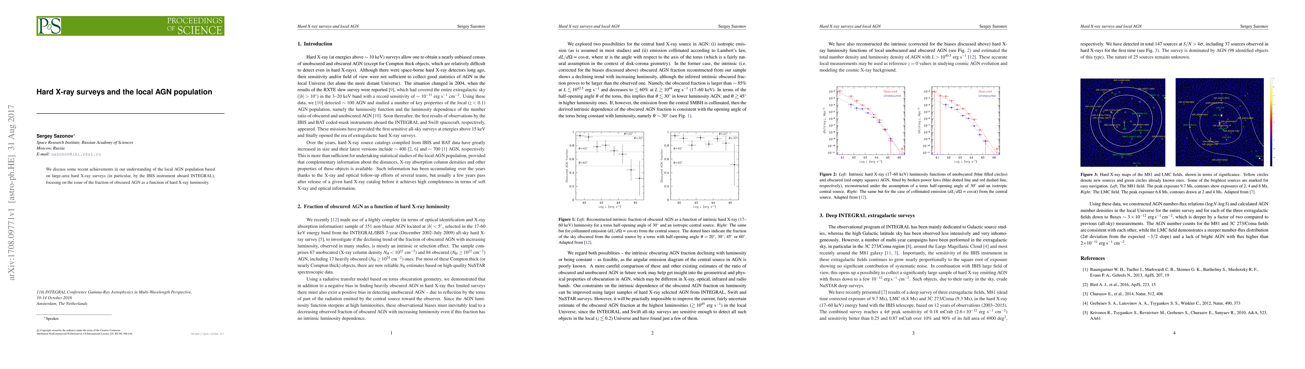 We discuss some recent achievements in our understanding of the local AGN population based on large-area hard X-ray surveys (in particular, by the IBIS instrument aboard INTEGRAL), focusing on the issue of the fraction of obscured AGN as a function of hard X-ray luminosity.