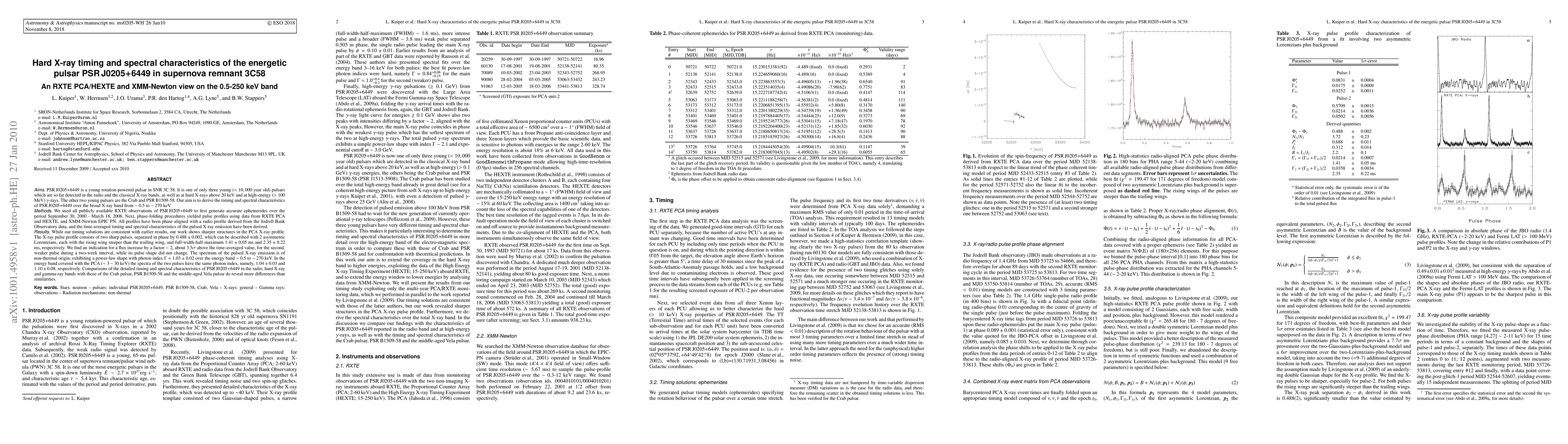 PSR J0205+6449 is a young rotation-powered pulsar in SNR 3C 58. It is one of only three young (<10,000 year old) pulsars which are so far detected in the radio and the classical X-ray bands, as well as at hard X-rays above 20 keV and at high-energy (>100 MeV) $\gamma$-rays. The other two young pulsars are the Crab and PSR B1509-58. Our aim is to derive the timing and spectral characteristics of PSR J0205+6449 over the broad X-ray band from ~0.5 to ~270 keV. We used all publicly available RXTE observations of PSR J0205+6449 to first generate accurate ephemerides over the period September 30, 2000 - March 18, 2006. Next, phase-folding procedures yielded pulse profiles using data from RXTE PCA and HEXTE, and XMM-Newton EPIC PN. While our timing solutions are consistent with earlier results, our work shows sharper structures in the PCA X-ray profile. The X-ray pulse profile consists of two sharp pulses, separated in phase by 0.488(2), which can be described with 2 asymmetric Lorentzians, each with the rising wing steeper than the trailing wing, and full-width-half-maximum 1.41(5) ms and 2.35(22) ms, respectively. We find an indication for a flux increase by a factor ~2, about 3.5 sigma above the time-averaged value, for the second, weaker pulse during a two-week interval, while its pulse shape did not change. The spectrum of the pulsed X-ray emission is of non-thermal origin, exhibiting a power-law shape with photon index Gamma = 1.03(2) over the energy band ~0.5 to ~270 keV. In the energy band covered with the PCA (~3-30 keV) the spectra of the two pulses have the same photon index, namely, 1.04(3) and 1.10(8), respectively.