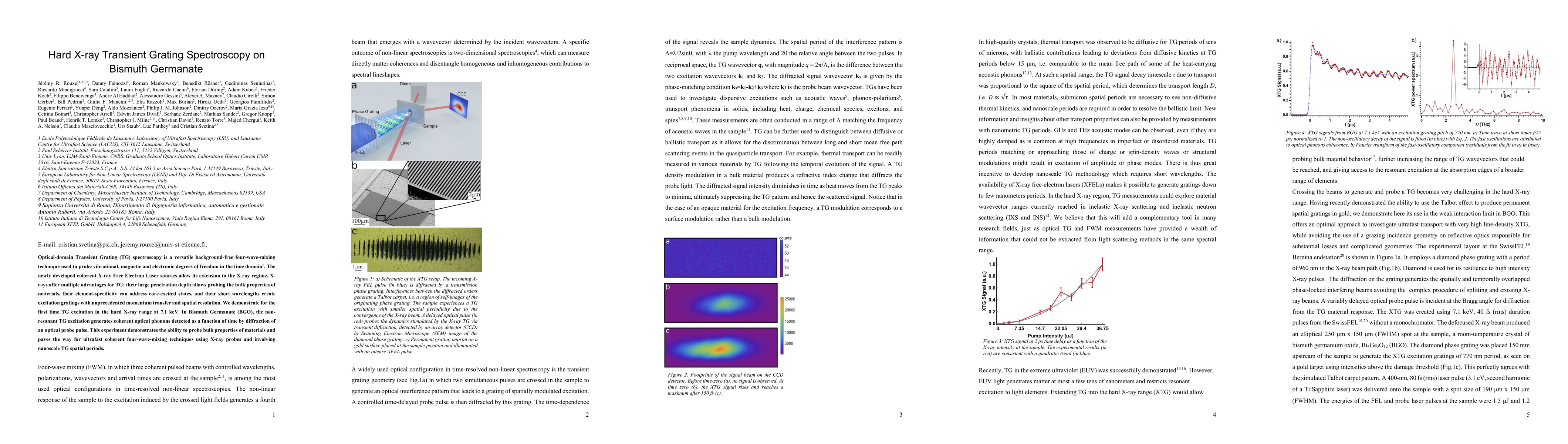 This paper demonstrates the first use of hard X-ray transient grating spectroscopy at 7.1 keV on Bismuth Germanate, showing the generation of coherent optical phonons. This technique, enabled by X-ray Free Electron Lasers, allows for probing bulk material properties and sets the stage for future nanoscale studies.