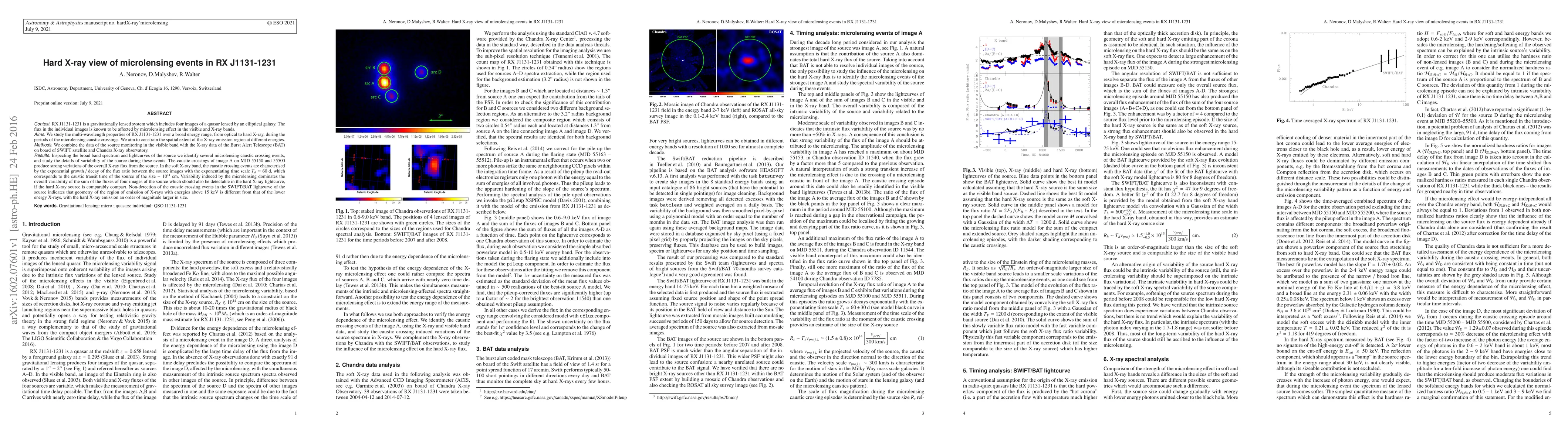 This paper investigates microlensing events in the gravitationally lensed system RX J1131-1231, observing significant flux variations in the X-ray band during caustic crossings. The study finds that while soft X-ray variability is compact, hard X-ray emission is much larger in spatial extent, suggesting different geometries for low and high energy X-ray regions.