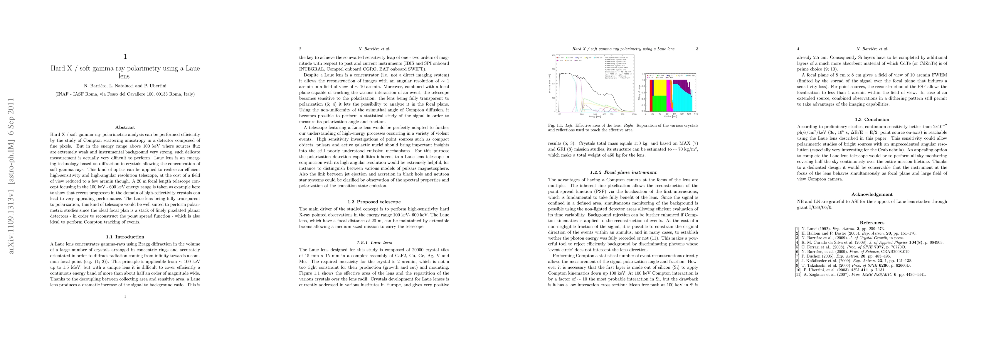 This paper explores the use of Laue lenses for high-sensitivity, high-angular resolution telescopes in the 100 keV - 600 keV energy range, demonstrating their potential for efficient hard X/soft gamma-ray polarimetry through diffraction-based concentration of weak gamma-ray sources. The proposed telescope design, despite a limited field of view, promises significant advancements in polarimetric studies due to the lens's transparency to polarization and the use of finely pixelated detectors.