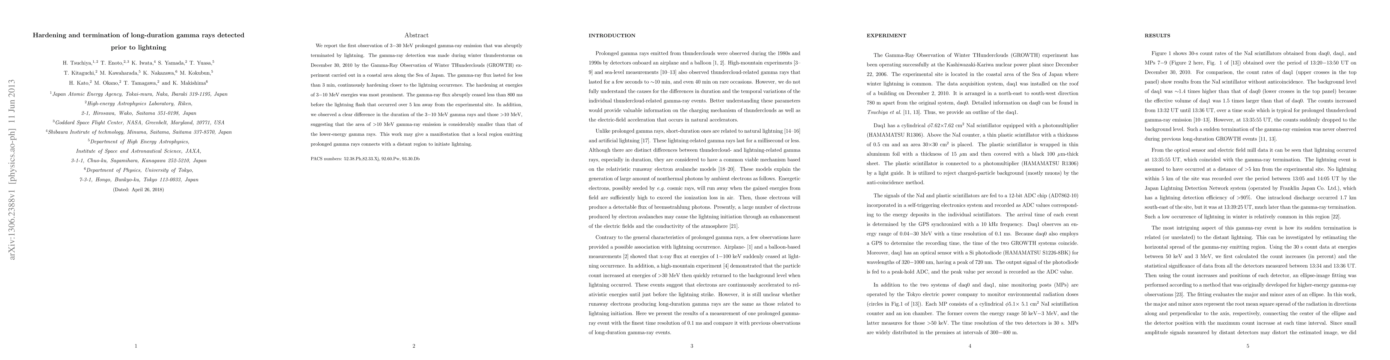 We report the first observation of 3$-$30 MeV prolonged gamma-ray emission that was abruptly terminated by lightning. The gamma-ray detection was made during winter thunderstorms on December 30, 2010 by the Gamma-Ray Observation of Winter THunderclouds (GROWTH) experiment carried out in a coastal area along the Sea of Japan. The gamma-ray flux lasted for less than 3 min, continuously hardening closer to the lightning occurrence. The hardening at energies of 3$-$10 MeV energies was most prominent. The gamma-ray flux abruptly ceased less than 800 ms before the lightning flash that occurred over 5 km away from the experimental site. In addition, we observed a clear difference in the duration of the 3$-$10 MeV gamma rays and those $>$10 MeV, suggesting that the area of $>$10 MeV gamma-ray emission is considerably smaller than that of the lower-energy gamma rays. This work may give a manifestation that a local region emitting prolonged gamma rays connects with a distant region to initiate lightning.