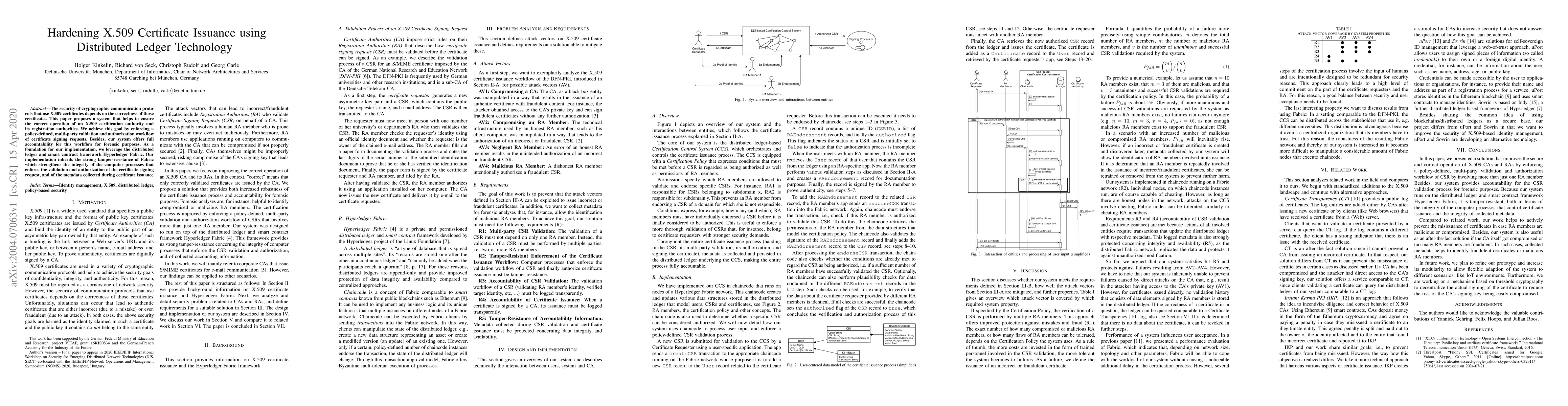 This paper proposes a system to harden the issuance of X.509 certificates using distributed ledger technology, specifically Hyperledger Fabric, to enforce multi-party validation and authorization workflows, ensuring integrity and accountability. The system leverages the tamper-resistance of Fabric to strengthen the security of certificate signing requests and associated metadata.