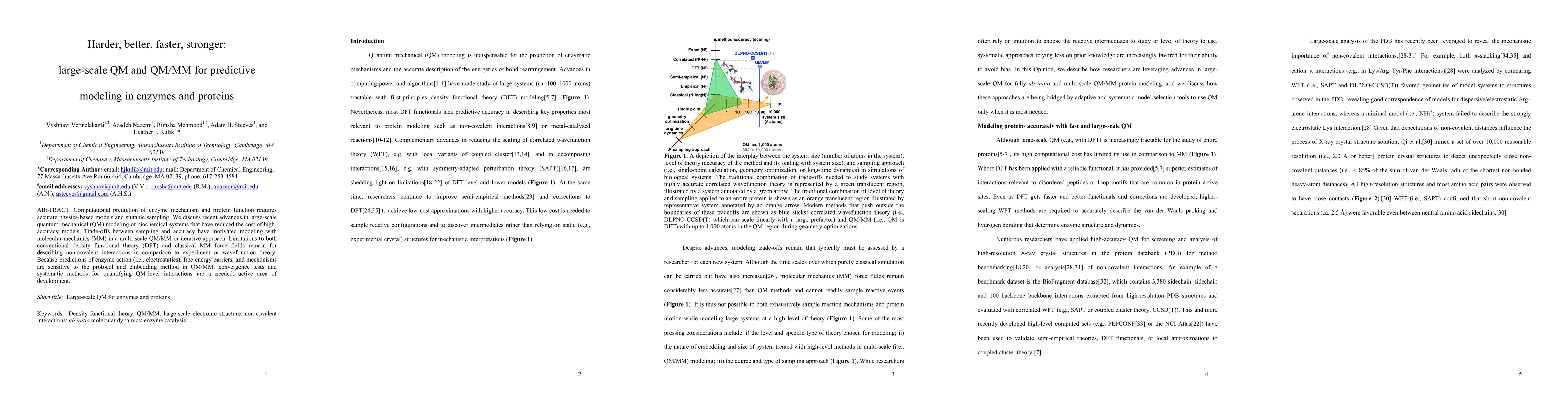 This paper discusses recent advances in large-scale quantum mechanical modeling for enzyme mechanisms and protein functions, highlighting reduced costs and improved accuracy. It emphasizes the trade-offs between sampling and accuracy, advocating for multi-scale QM/MM approaches, while noting limitations in conventional DFT and classical MM force fields for non-covalent interactions.