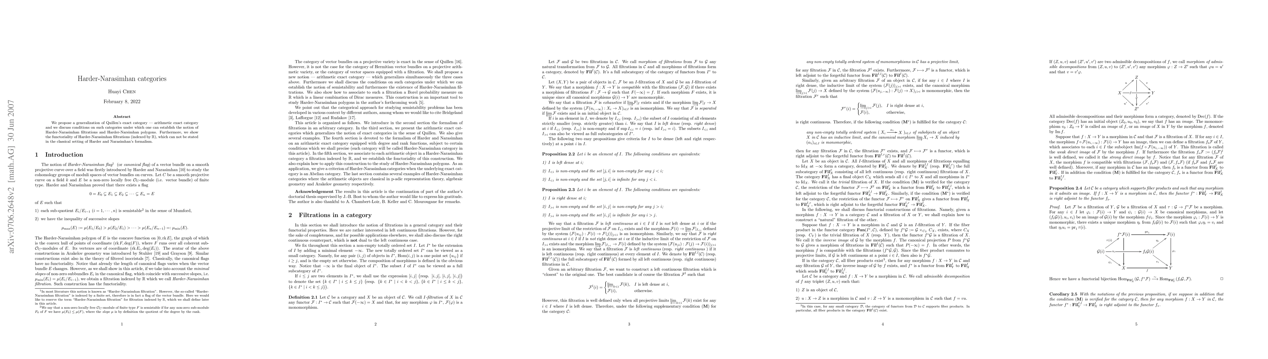 This paper generalizes Quillen's exact category to arithmetic exact categories and explores conditions allowing for the introduction of Harder-Narasimhan filtrations and polygons. It also demonstrates the functoriality of these filtrations, extending beyond the classical framework.