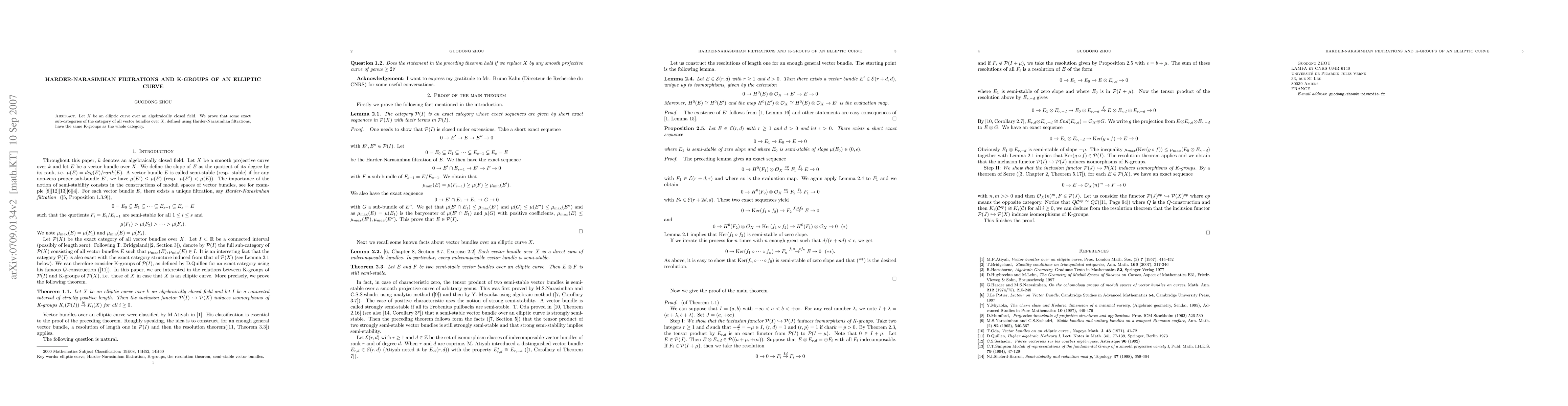 This paper proves that certain subcategories of vector bundles on an elliptic curve, characterized by Harder-Narasimhan filtrations, share the same K-groups as the entire category of vector bundles over the curve. The results rely on the structure of Harder-Narasimhan filtrations and their implications for K-theory.