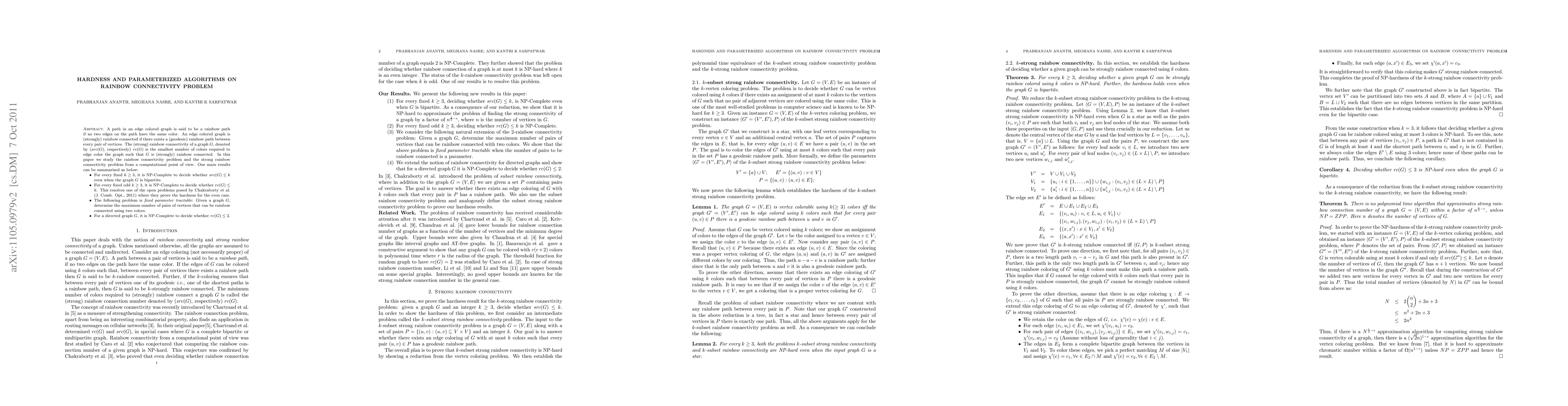 A path in an edge colored graph is said to be a rainbow path if no two edges on the path have the same color. An edge colored graph is (strongly) rainbow connected if there exists a (geodesic) rainbow path between every pair of vertices. The (strong) rainbow connectivity of a graph G, denoted by (src(G), respectively) rc(G) is the smallest number of colors required to edge color the graph such that G is (strongly) rainbow connected. In this paper we study the rainbow connectivity problem and the strong rainbow connectivity problem from a computational point of view. Our main results can be summarised as below: 1) For every fixed k >= 3, it is NP-Complete to decide whether src(G) <= k even when the graph G is bipartite. 2) For every fixed odd k >= 3, it is NP-Complete to decide whether rc(G) <= k. This resolves one of the open problems posed by Chakraborty et al. (J. Comb. Opt., 2011) where they prove the hardness for the even case. 3) The following problem is fixed parameter tractable: Given a graph G, determine the maximum number of pairs of vertices that can be rainbow connected using two colors. 4) For a directed graph G, it is NP-Complete to decide whether rc(G) <= 2.