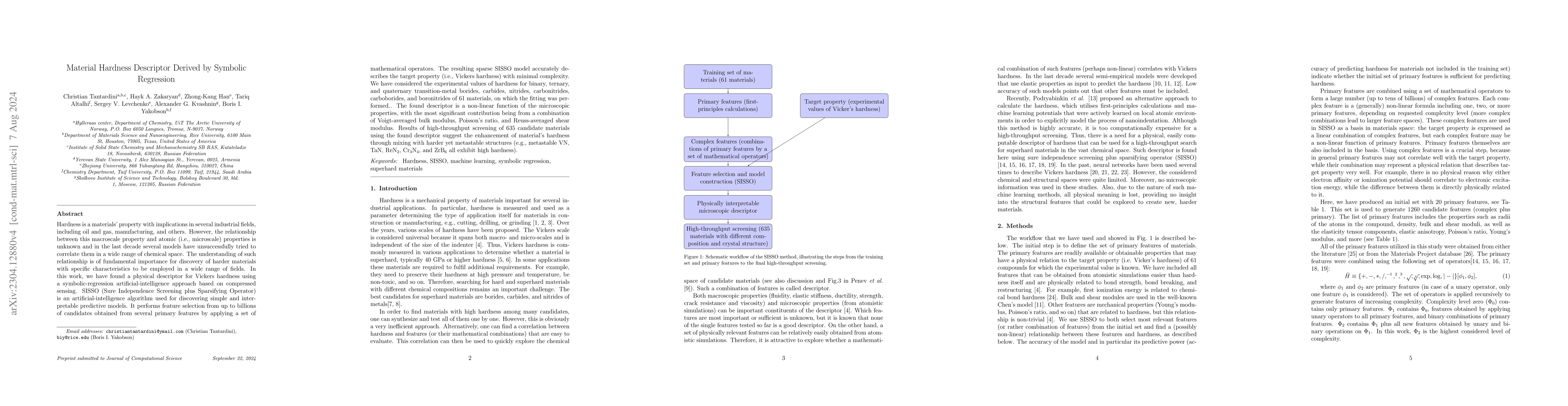 This paper develops a symbolic regression-based physical descriptor for Vickers hardness using SISSO, combining atomistic simulation features with experimental data for 635 compounds. The derived descriptor highlights the importance of bulk modulus, Poisson's ratio, and shear modulus in predicting hardness, suggesting potential for discovering harder materials through metastable structures.