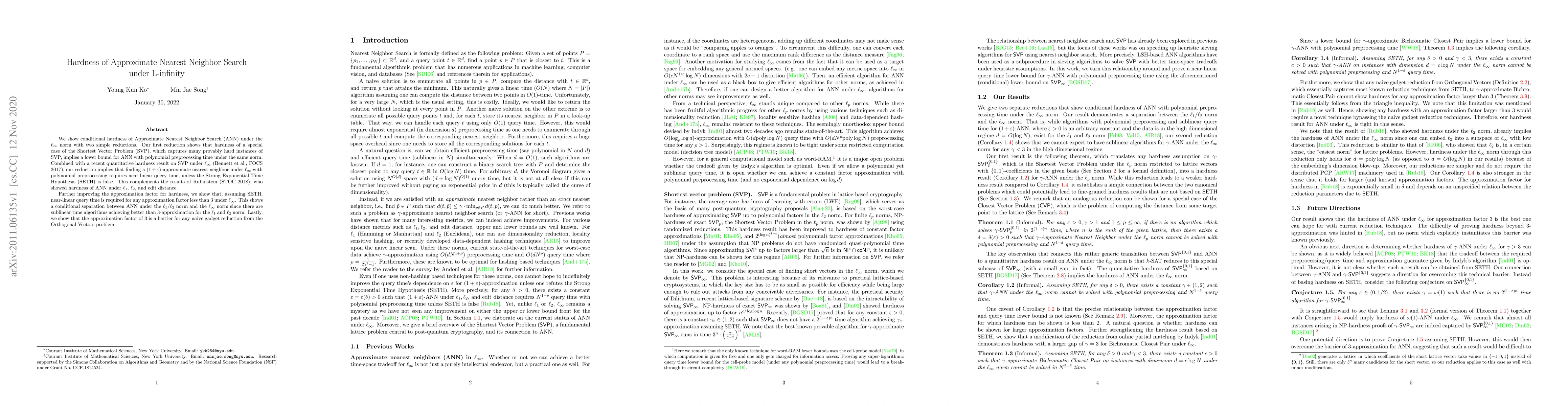 This paper demonstrates the conditional hardness of Approximate Nearest Neighbor Search (ANN) under the $\ell_\infty$ norm, showing that near-linear query time is required for $(1+\varepsilon)$-approximation unless the Strong Exponential Time Hypothesis (SETH) is false. It also establishes a separation between ANN under $\ell_\infty$ and $\ell_1/\ell_2$ norms, as sublinear time algorithms exist for better than $3$-approximation under $\ell_1$ and $\ell_2$.