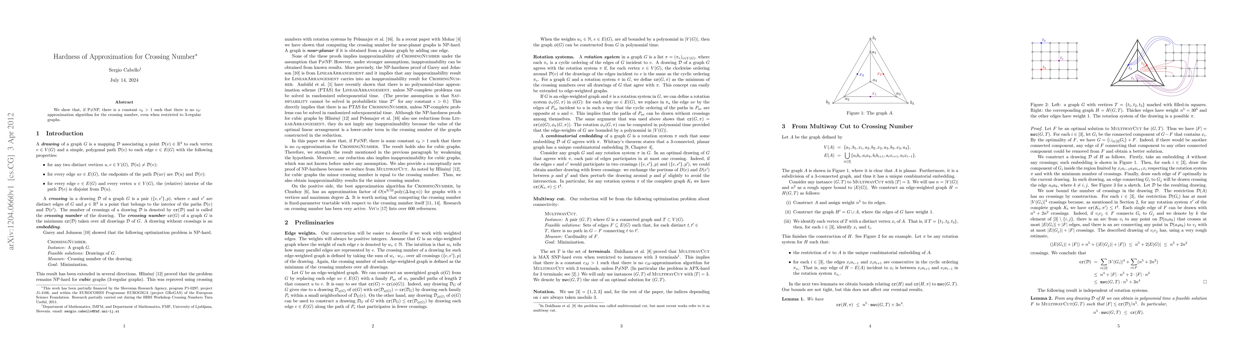 Summary: The paper proves that, under the assumption P≠NP, there exists no constant c > 1 that allows for a c-approximation algorithm for the crossing number problem, even when limited to 3-regular graphs. This result highlights the computational hardness of the problem.